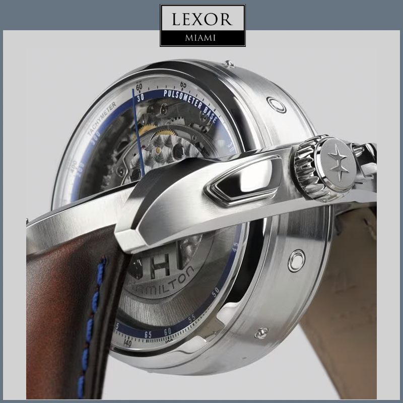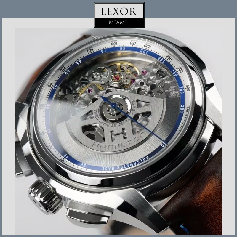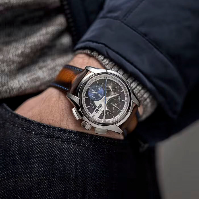El Jazzmaster Face 2 Face III, una maravilla de edición limitada de 999 piezas, no es solo un reloj, sino una declaración de diseño y funcionalidad intrincados. Cuenta con una caja giratoria de doble cara única con un diseño de semiesqueleto, que ofrece una exhibición espectacular de habilidad relojera. Un lado presenta un diseño de cronógrafo clásico con detalles azules, mientras que el reverso ofrece una esfera esqueletizada que muestra el movimiento de cronógrafo automático H-41 basado en Valjoux 7750.