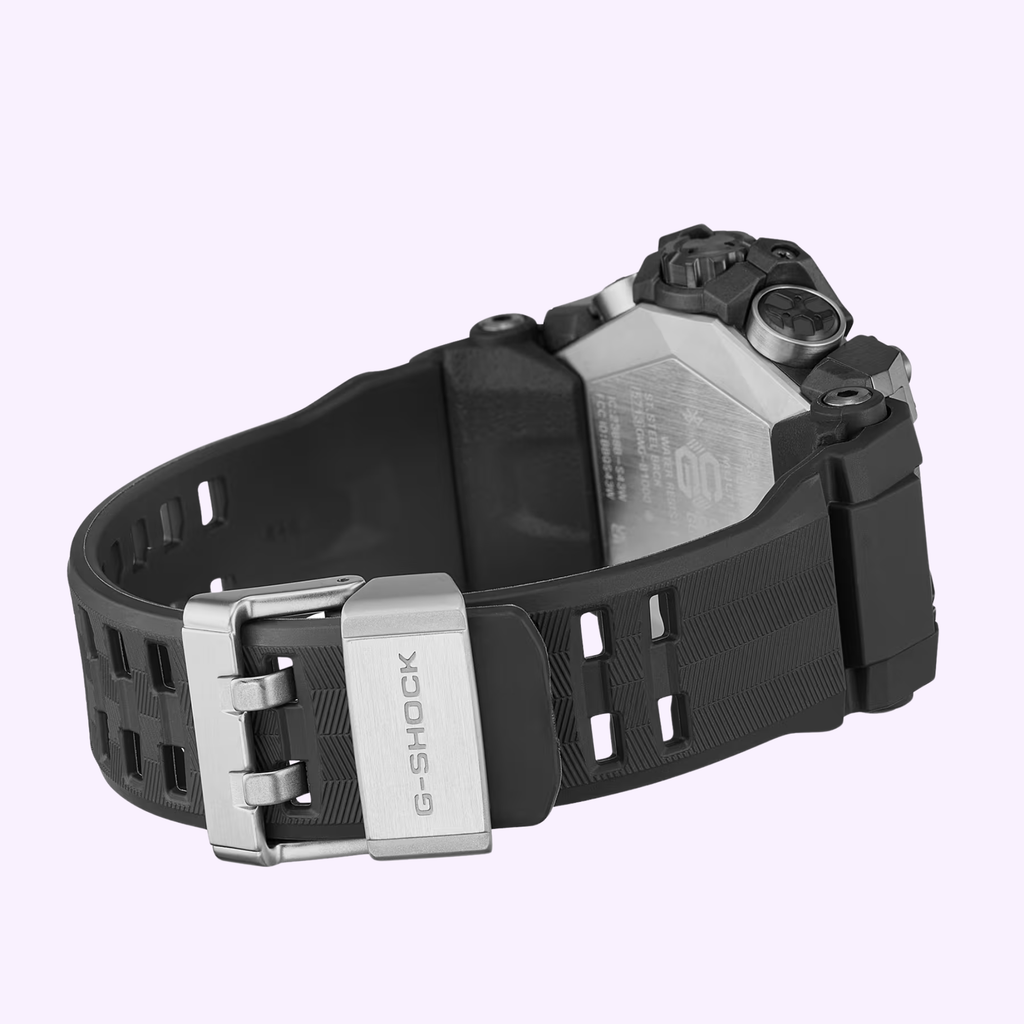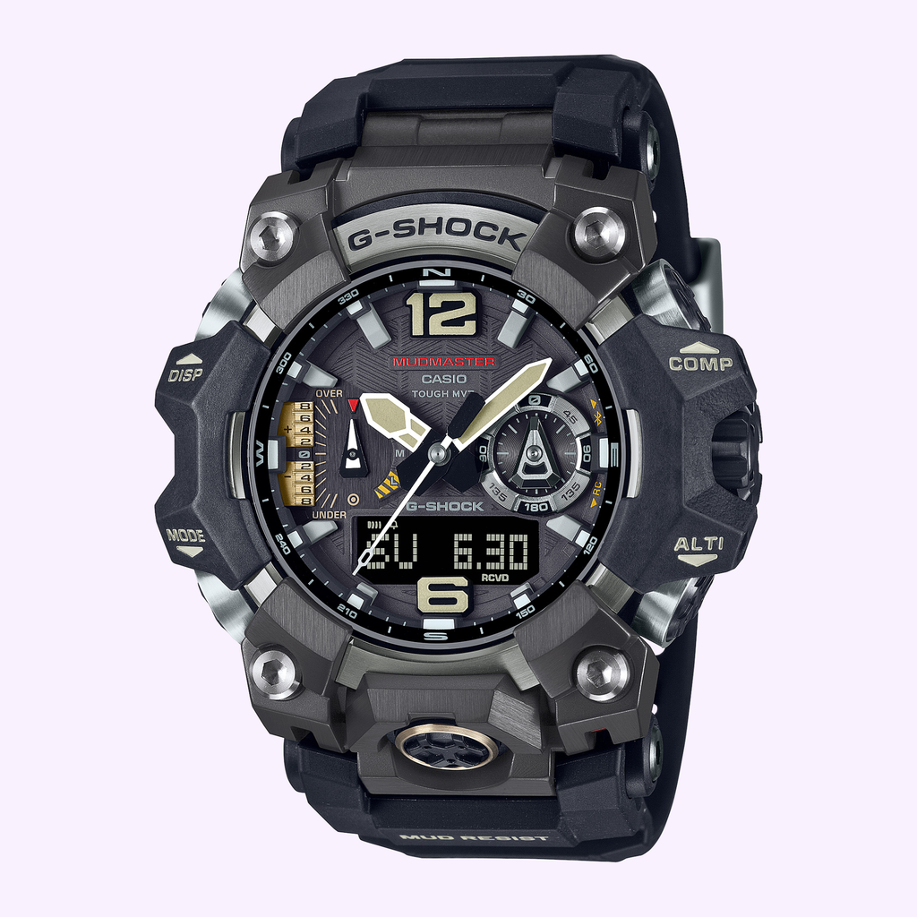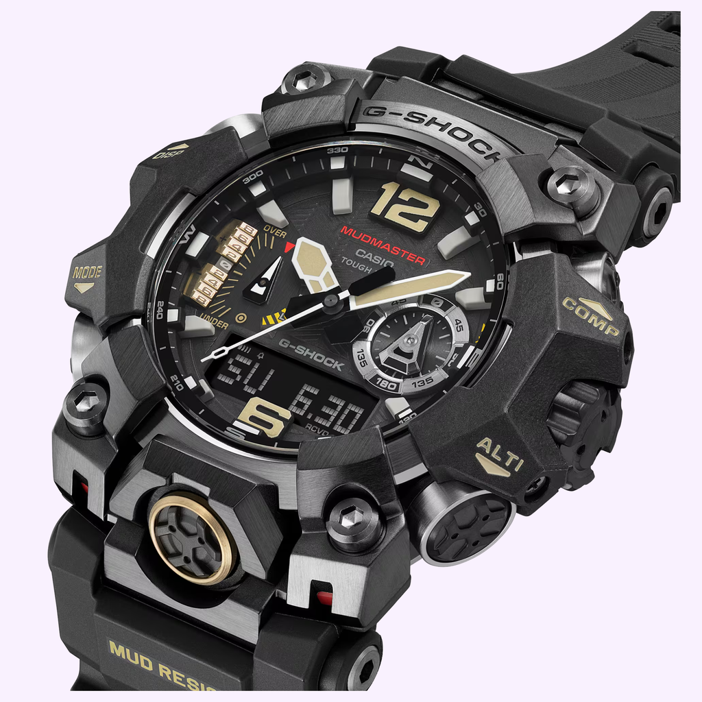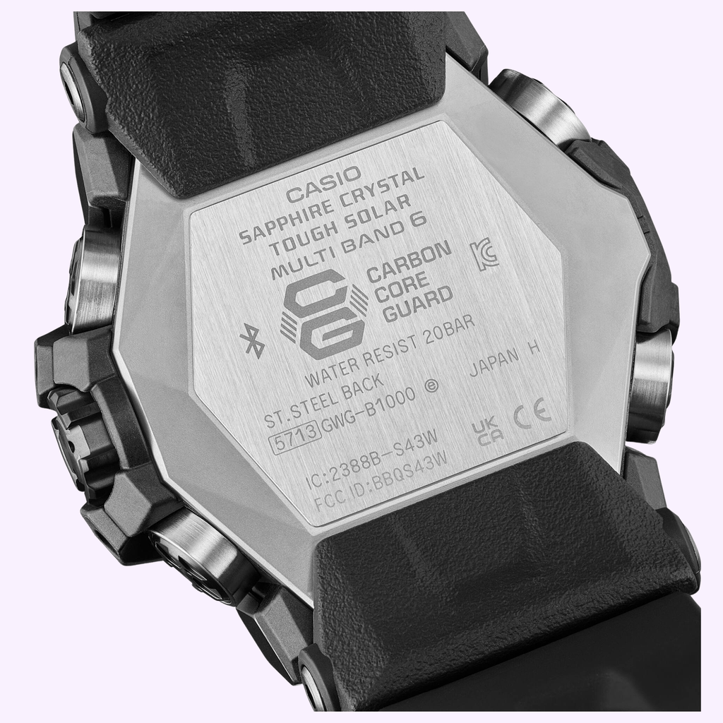 Enjoy both fearless adventure and a comfortable fit with this tough and rugged Master of G Mudmaster flagship timepiece. This analog-digital combination watch delivers more comfortable fit and outstanding durability with a robust exterior incorporating a guarding structure built with metal components. The watches of the G-SHOCK Master of G line, developed for professionals working in the harshest environments, come equipped with even tougher functionality. And the MUDMASTER takes this even further with the ability to handle the roughest on-land environments, earning the appreciation and trust of rangers and rescue teams operating in extreme environments. The comfortably sized GWG-B1000 features a metal exterior crafted with high-precision forging techniques and a carbon fiber-reinforced resin case*1 that offers high strength and outstanding durability. Radio-controlled and solar-powered, the watch is also equipped with a triple sensor that keeps you updated with direction, altitude, barometric pressure, and temperature readings. Double LED lights and sapphire crystal ensure high readability so you always see the time and other readings, no matter what the conditions are like. Input a specific location in the app and the Location Indicator function moves the indicator hand at the 3 o’clock position to point in that direction so you stay on track at all times — even when visibility is obstructed by extreme conditions like sandstorms. The use of bio-based resins for the case, some bezel components, and the band make for a watch that demonstrates the MUDMASTER commitment to the environment. *1 Due to the characteristics of carbon fiber-reinforced resin, the pattern and color tone that appears on the surface will vary model by model.