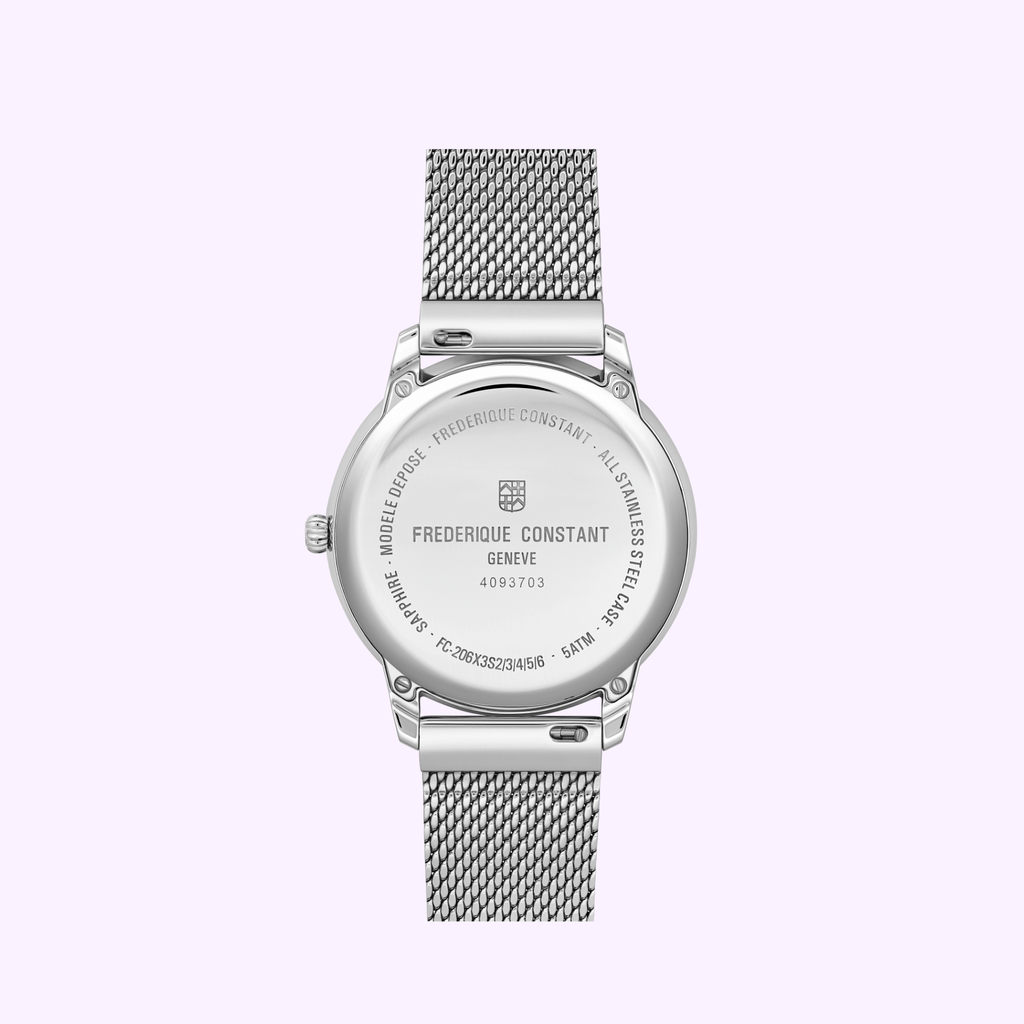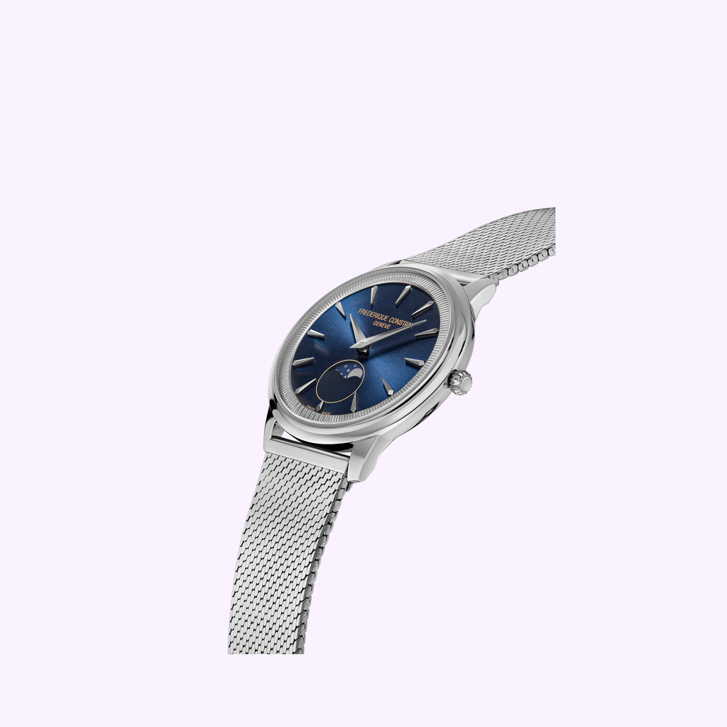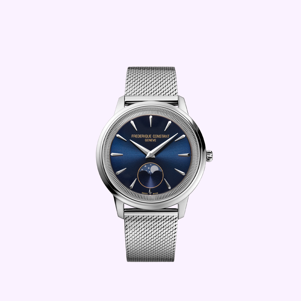 The new Classics Moneta Moonphase takes its name from its flange, which draws inspiration from the milled edge of a coin. This timepiece is offered in a unisex 37mm steel case that offers a fresh take on the fluted bezel. Sporting a navy blue dial with sunray finishing, moonphase at 6 o'clock, anti-reflective convex sapphire crystal, and water-resistant to 5M, it boasts all the traditional finishes of fine watchmaking at an accessible price, thanks to a quartz movement that comes with a 5-year power reserve. Delivered on a Milanese style stainless steel bracelet.