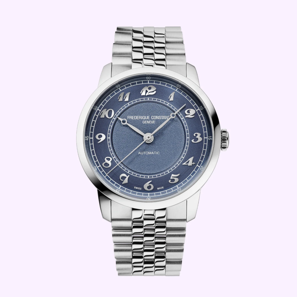 The hallmark of all things classic is that they never go out of fashion. Fine Geneva watchmaking wrote the style guide in question over two centuries ago, and its precepts are just as relevant today. The Classics Premiere embodies this approach, combining tradition and modernity. It comes in a diameter of just 38.5mm: timeless and perfect for any wrist. Polished stainless steel 3-part case, cloud blue color dial featuring a two level design with a matte and sandblasted finish, complimented by applied polished Arabic numerals. Delivered on the new 5 links Jubile bracelet.