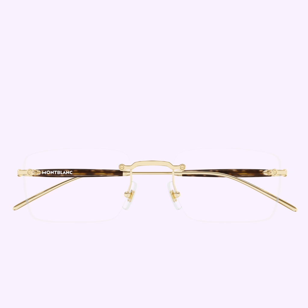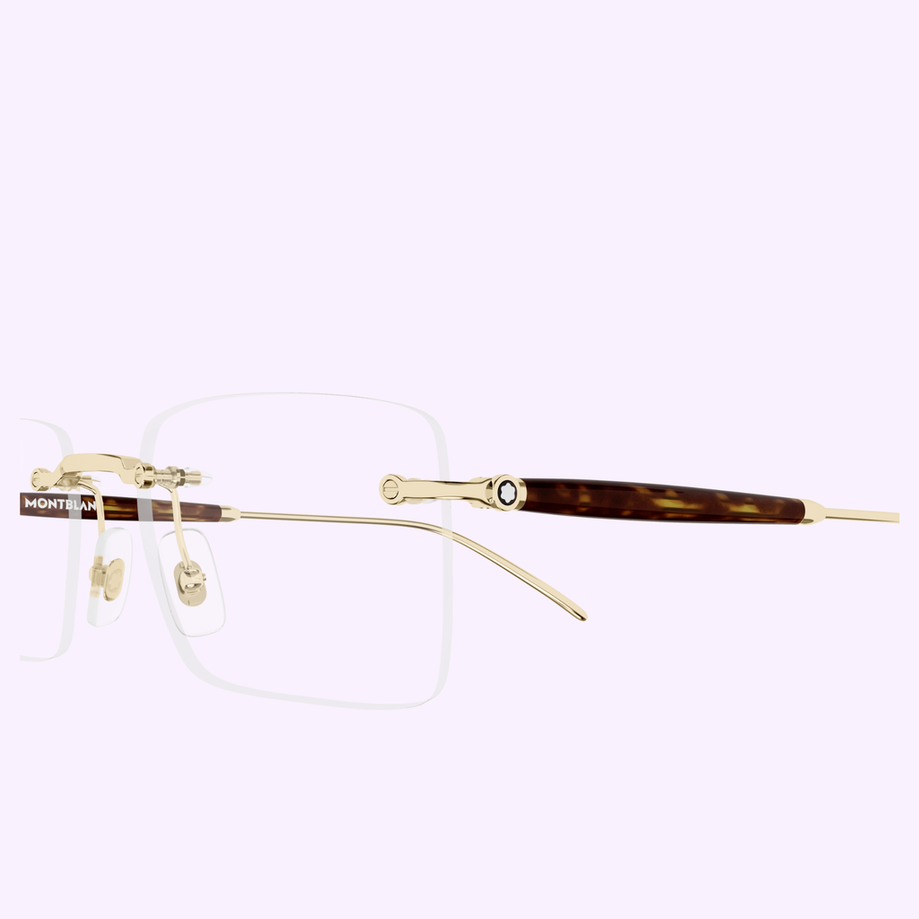 Rimless optical style part of the Meisterstück pillar and aimed at celebrating Meisterstück Anniversary with a new family inspired by writing instruments. The temple’s silhouette is inspired by the signature shape of Meisterstück writing instruments. The iconic branding element is represented by the metal ring on temples featuring Montblanc lettering logo and a more subtle metal ring on temple tips. The color palette features Montblanc's classic black, a dark petrol and a new grey.