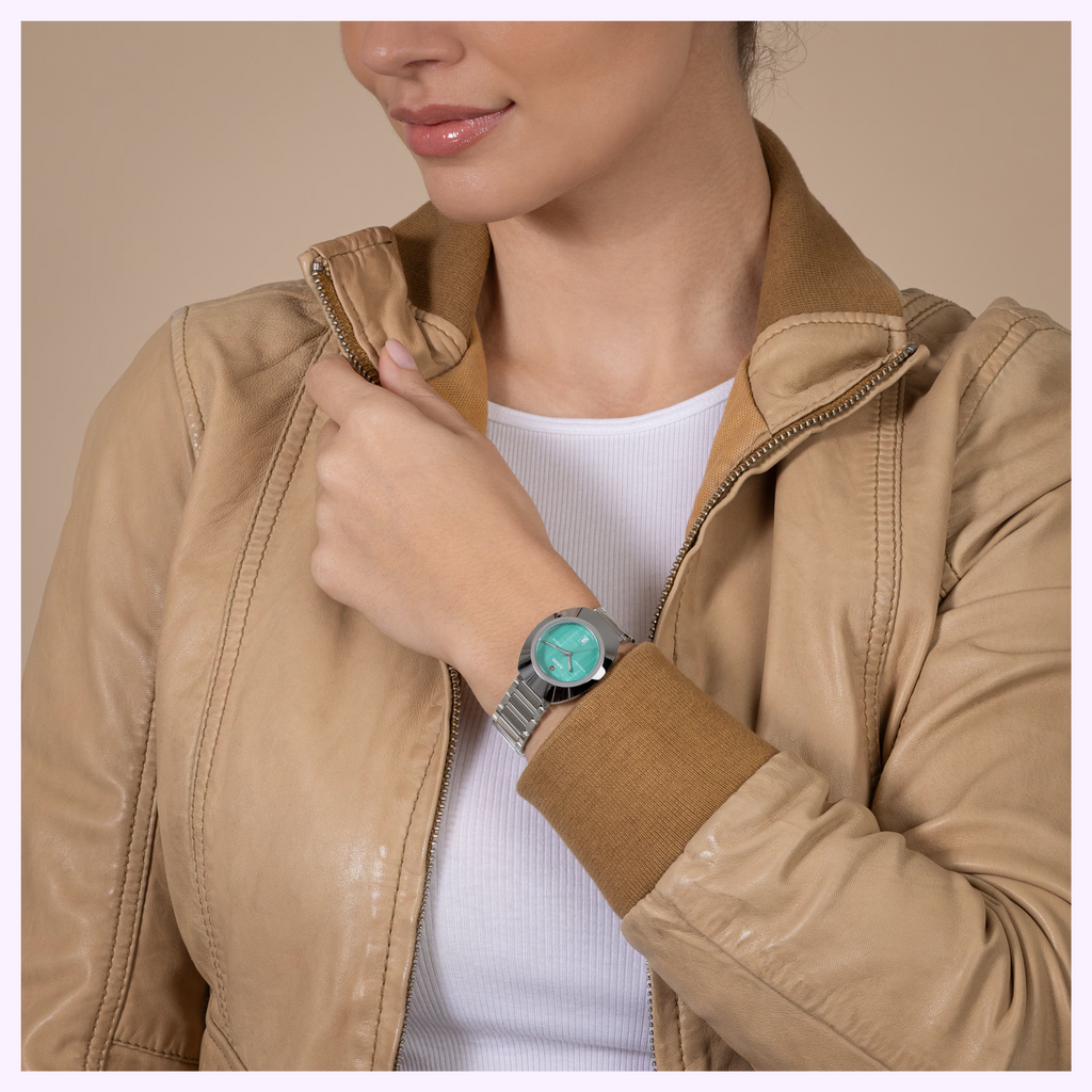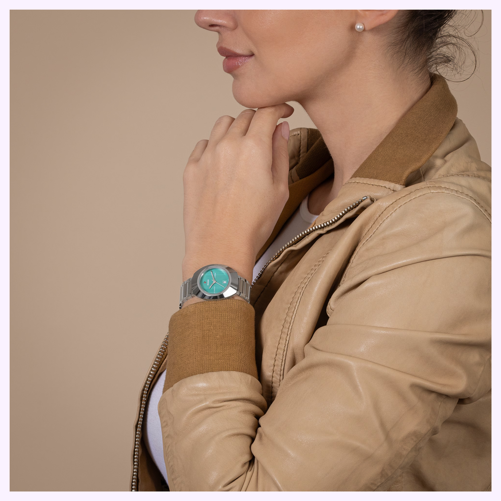 An iconic symbol of Swiss craftsmanship and pioneering innovation. The Rado Diastar is designed for those who dare to embrace the extraordinary. The 30 mm case, crowned by a polished platinum-coloured Ceramos™ bezel, merges effortlessly with a polished stainless-steel middle case, offering water resistance up to 10 bar (100 metres). The turquoise dial, brushed in two directions, plays elegantly with light, highlighting the iconic silver-coloured moving anchor and a meticulously positioned date window at 6 o’clock. Rhodium-coloured hands with white Super-LumiNova® ensure perfect readability at all times. This refined display is safeguarded by vertical faceted sapphire crystal with anti-reflective coating inside. At its heart lies the automatic R586 calibre, finely regulated in five positions and featuring a Nivachron™ hairspring, this movement delivers a high level of accuracy and 48-hour power reserve. The overall appearance of this iconic timepiece is completed with a stainless-steel bracelet, blending polished links and brushed middle links, secured by a 3-fold clasp.