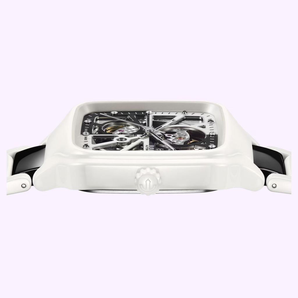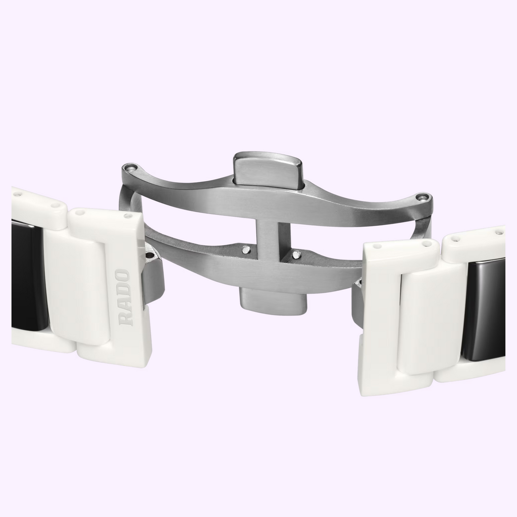 This watch has a white high-tech ceramic monobloc case and crown, and its bracelet – also in polished high-tech ceramic – is white and black. The sandblasted titanium case back is fitted with a sapphire crystal and special engraving featuring the words LIMITED EDITION ONE OUT OF 888. Like its black counterpart, it features a black and white vertically brushed dial highlighted by eight white full-cut diamond hour markers and four black ones. It also shares some of the other aesthetic codes that define the stunning dial: the rhodium-coloured bevels, the black flange, and the distinctive rhodium-coloured moving anchor symbol on a contrasting black background. And its identity is confirmed by the silver printed Rado and black printed Automatic logos.