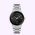 Sleek and polished, with single diamond at 12 o'clock and minimalist-design hour markers on matte black dial. Stainless steel case and bracelet with double-press fold-over closure.