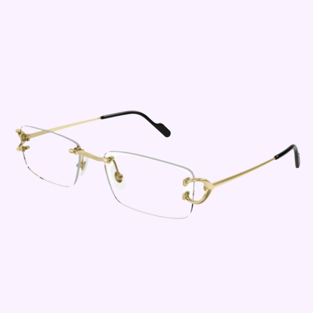 New modern execution of the C Décor aesthetics strongly linked to its historical DNA. Rectangular rimless construction embellished by the iconic C decor detail on the hinge. Acetate temple tips enriched by the Cartier logo plaque.