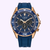 The rich blue dial, decorated with a wave-textured motif, provides a striking backdrop for the rose gold-tone applied indices, luminous hands, and contrasting chronograph registers. A discreet date window between the 4 and 5 o’clock positions, adding everyday utility. Caliber B620.