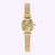 Measuring 18.4mm, the round yellow gold-tone stainless steel case is paired seamlessly with an ultra-slim bracelet for a graceful, luminous presence on the wrist. Distinct lugs and a faceted mineral crystal add sculptural detail, while a crown accented with a subtle red cabochon adds a vibrant touch of contrast. A matching gold-tone sunray dial completes the look, accented with applied indices and sword-style hands. Water resistant up to 30 meters. Caliber G626.