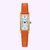 Measuring 14.3 by 30.7mm, the elongated yellow gold-tone stainless steel case is distinguished by angled lugs, a raised mineral crystal, and a crown accented with a subtle red cabochon for a touch of warmth. On the silver sunray dial, blue accents highlight the applied indices and slender sword-style hands, offering a crisp contrast that enhances clarity and style. A rich orange leather strap completes the look, adding a modern, colorful flourish. Water resistant up to 30 meters. Caliber G620.