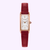 Measuring 14.3 by 30.7mm, the elongated rose gold-tone stainless steel case is distinguished by angled lugs, a raised mineral crystal, and a crown accented with a subtle red cabochon. The silver sunray dial is understated yet luminous, elevated with rose gold-tone applied indices and slender sword-style hands for a timeless presentation. Completing the look, a rich red leather strap enhances the watch’s refined profile with a bold yet sophisticated touch. Water resistant up to 30 meters. Caliber G620.