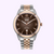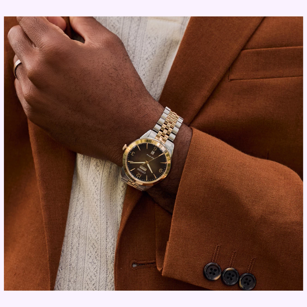 This vintage-inspired timepiece is a paragon of timeless elegance. With a 40.5mm, two-tone silver- and rose gold-tone case and matching five-link bracelet, the new Rolan features a rich brown dial with a gradient effect. Applied rose gold-tone accents and Arabic numerals at the quarter hours add to its charm, while day and date indicators on opposite sides of the top and bottom of the dial place the watch firmly in the realm of retro-style. The watch features Citizen's Eco-Drive technology – sustainably powered by light, any light, and never needs a battery. Water resistant to 100 meters. Caliber J800.
