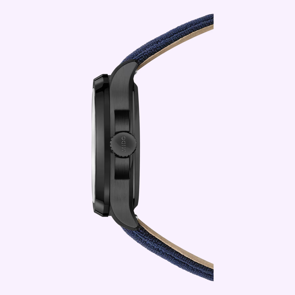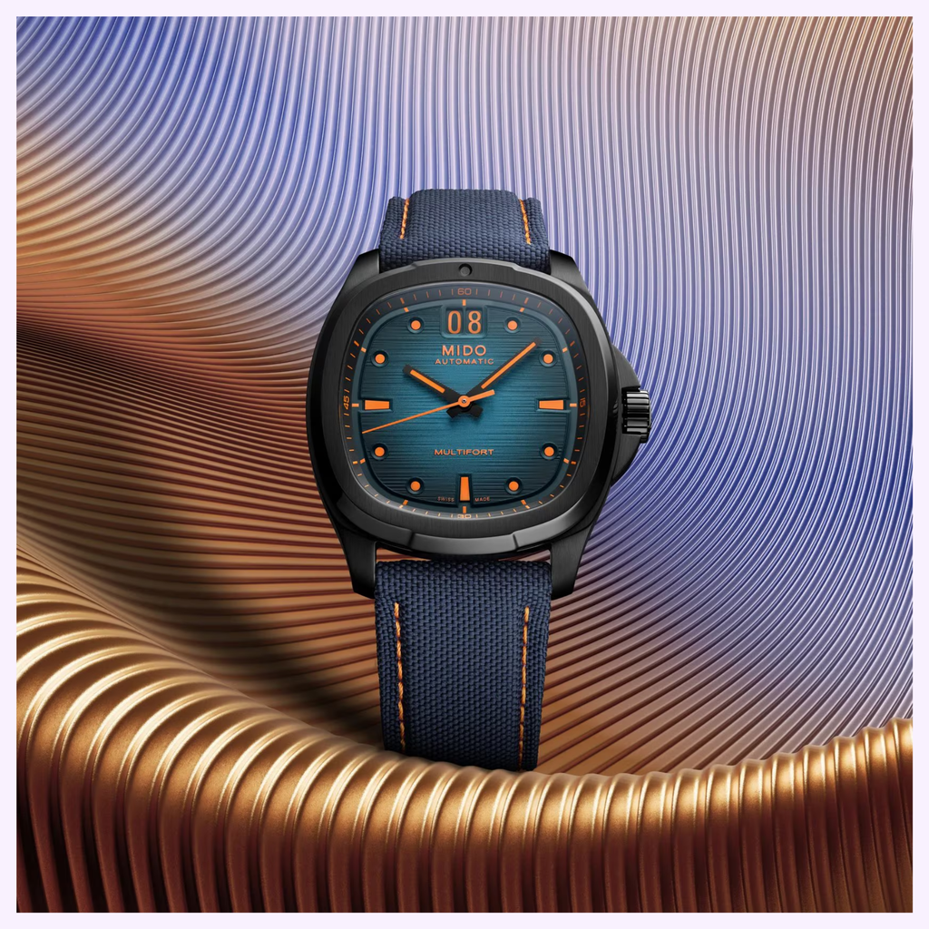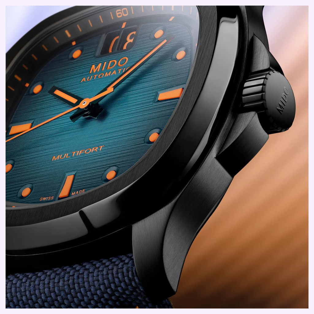 A brilliant flashback! Born from MIDO's extraordinary heritage, the TV-shaped case returns to centre stage for the Multifort TV Big Date, as intense as it is precise, thanks to its formidable mechanical movement. The modern and dynamic design of this Swiss watch is highlighted by a striking dial and, along with its distinctive function: the BIG DATE at 12 o'clock. Its formidable latest-generation automatic movement, Caliber 80, is equipped with a high-tech balance spring in Nivachron™, which offers outstanding resistance to shocks and magnetic fields.