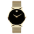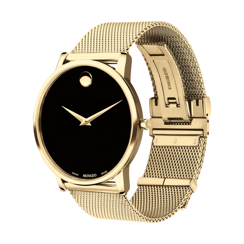 Movado Museum Classic, 40mm yellow gold PVD-finished stainless steel case and mesh bracelet with a black-toned dial.