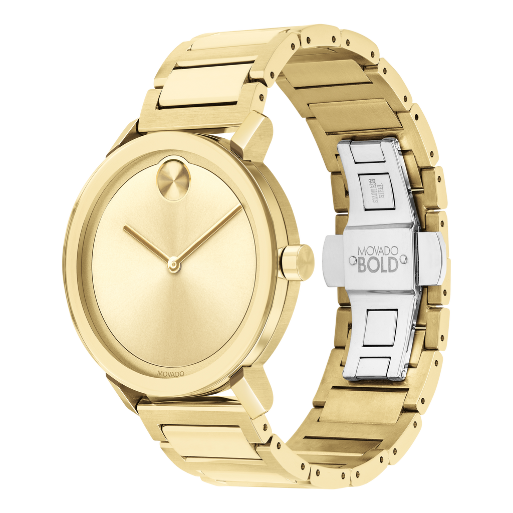 Large Movado BOLD Evolution watch, thin 40 mm pale gold ion-plated stainless steel case, K1 crystal, pale gold sunray dial with matching sunray dot/hands, pale gold ion-plated stainless steel link bracelet with push-button deployment clasp.