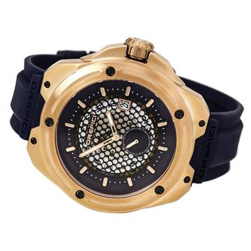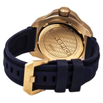 • Orefici ORM15S4708 Men's Special Editions Blue Dial Rose Gold Steel Blue Strap WatchOrefici ORM15S4708 Special Editions men's watch features a 48mm wide and 14mm thick rose gold ion plated solid stainless steel case with a fixed bezel and a textured screw down crown. Orefici ORM15S4708 is powered by an accurate Swiss Ronda 5030.D quartz movement. This stylish watch also features a perforated blue dial with white accents rose gold tone luminous skeleton hands and index hour markers along with the date display function, scratch resistant mineral crystal and water resistant to 100 meters. Orefici ORM15S4708 is equipped with a 24mm wide blue rubber strap with a buckle clasp. Orefici ORM15S4708 men's Special Editions blue dial rose gold steel blue strap watch is brand new and comes in an original Orefici gift box and is backed by a 2 years store warranty.