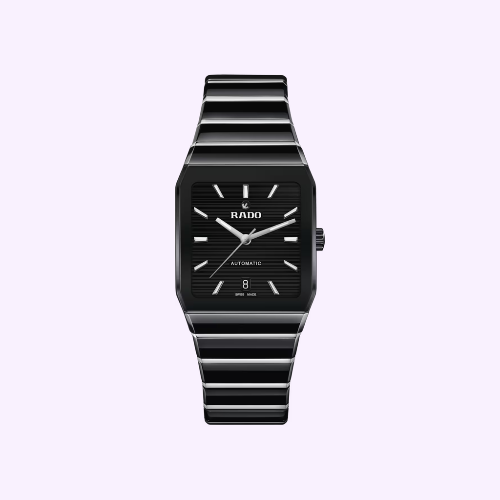 Since its debut in 1983, the Rado Anatom has stood as a symbol of groundbreaking design and ultimate comfort. Its signature feature is the cylindrical metallised sapphire crystal with bevelled edges on both sides, extending seamlessly into the high-tech ceramic bracelet, creating a smooth, continuous form that merges the case and bracelet into a unified, cohesive shape. Crafted from polished black high-tech ceramic links and polished stainless steel middle links, the bracelet is meticulously secured by a brushed stainless steel 3-fold clasp. Beneath this distinctive crystal lies a black lacquered dial revealing a striking pattern of irregularly spaced horizontal lines. Rhodium-coloured applied hands and indexes with coated white Super-LumiNova® create a refined contrast against the dial’s depth. Crowning the dial at 12 o’clock is the iconic moving anchor, complemented by a discreet date window positioned at 6 o’clock. Beating at its heart, and exalted through the sapphire crystal caseback, is the 21-jewels Automatic R766 calibre. Finely regulated in five positions and equipped with a Nivachron™ hairspring, this movement delivers a high level of accuracy and a robust 72-hour power reserve, underlining Rado's commitment to perfection.