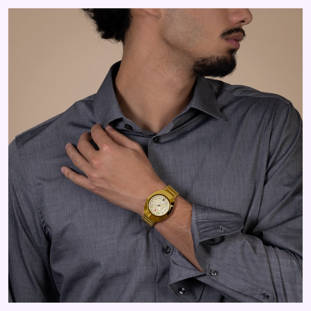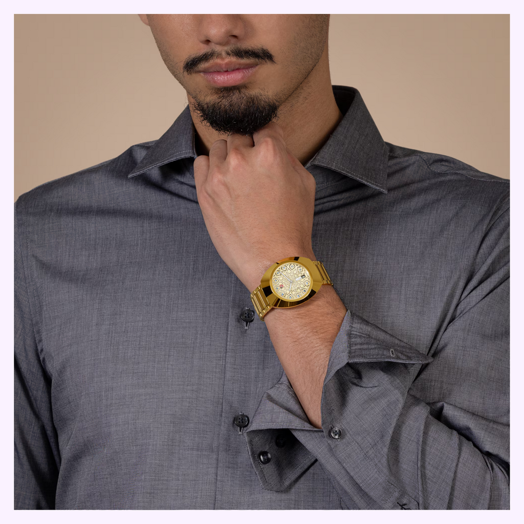 The unique DiaStar Original has a diameter of 38 mm and is water resistant down to 100 m. Framed by an ultra-shiny yellow gold couloured Ceramos™ coiffe with polished angles and detailing set over a matching, yellow gold couloured PVD coated stainless-steel case, this beautiful watch is rounded off with a vertical faceted sapphire crystal. Specifications include rhodium coloured hands with white Super-LumiNova®, and a white day display and a black date display. The dial features eleven light blue cubic zirconia, on a rhodium coloured harmonic pattern on a diamond powder decoration. The Rado R764 automatic movement offers 80 hours of power reserve, with an antimagnetic Nivachron™ balance spring. The bracelet is made of yellow gold PVD coated polished and brushed stainless steel.