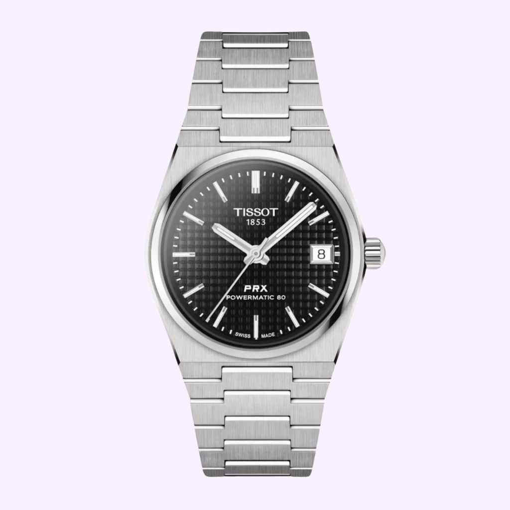 Discover the Tissot PRX 35mm Powermatic 80, a captivating blend of timeless elegance and modern innovation. This 35mm watch features a high-quality steel case and a sleek black dial, reimagining its iconic 1978 roots. The distinctive waffle dial pattern adds a touch of sophistication and sets the automatic model apart. Water-resistant up to 100 meters and equipped with a Nivachron™ balance hairspring, the PRX is a versatile piece for discerning watch enthusiasts. The satin-finish steel bracelet with a triple-blade folding steel clasp ensures a comfortable fit. Embrace the allure of the Tissot PRX 35mm Powermatic 80 in black.