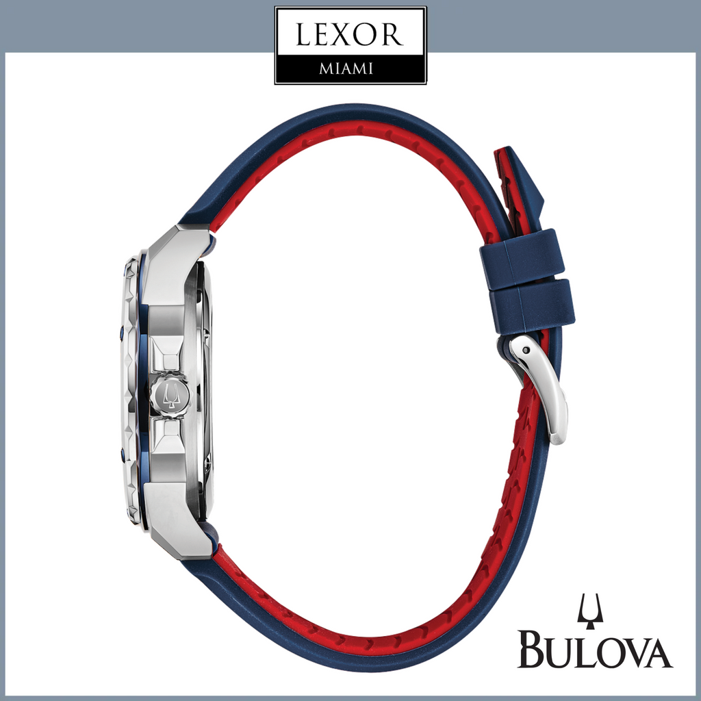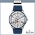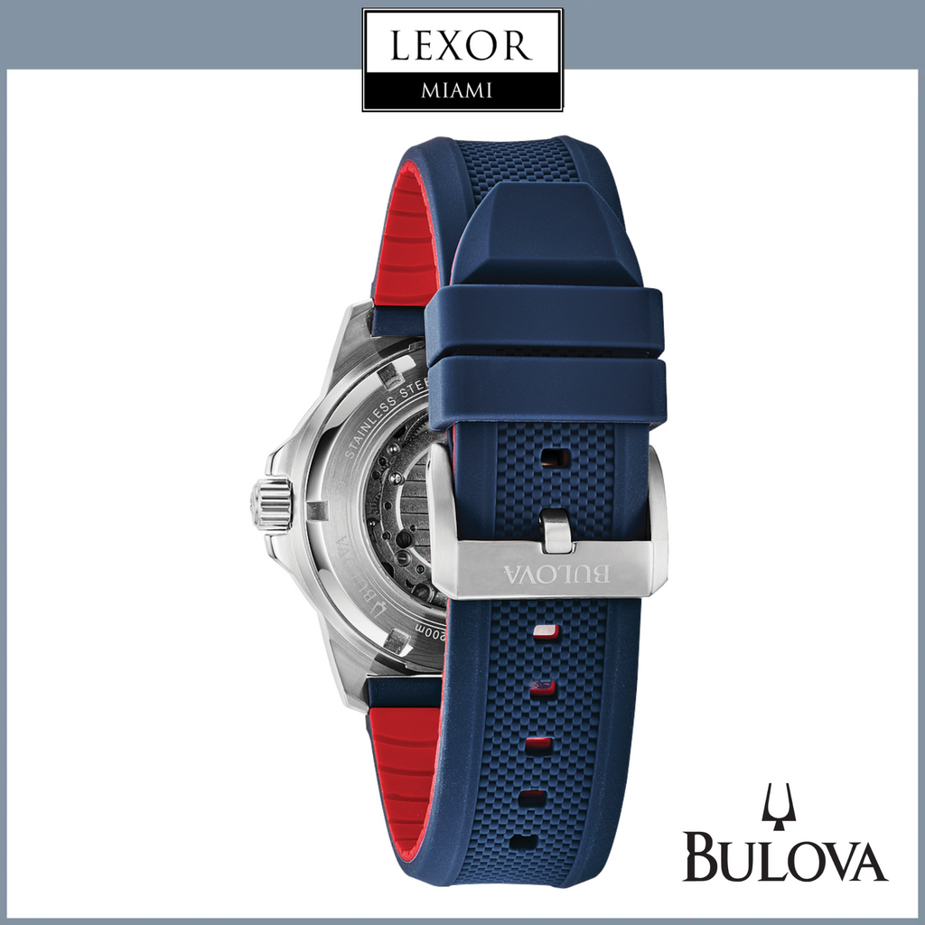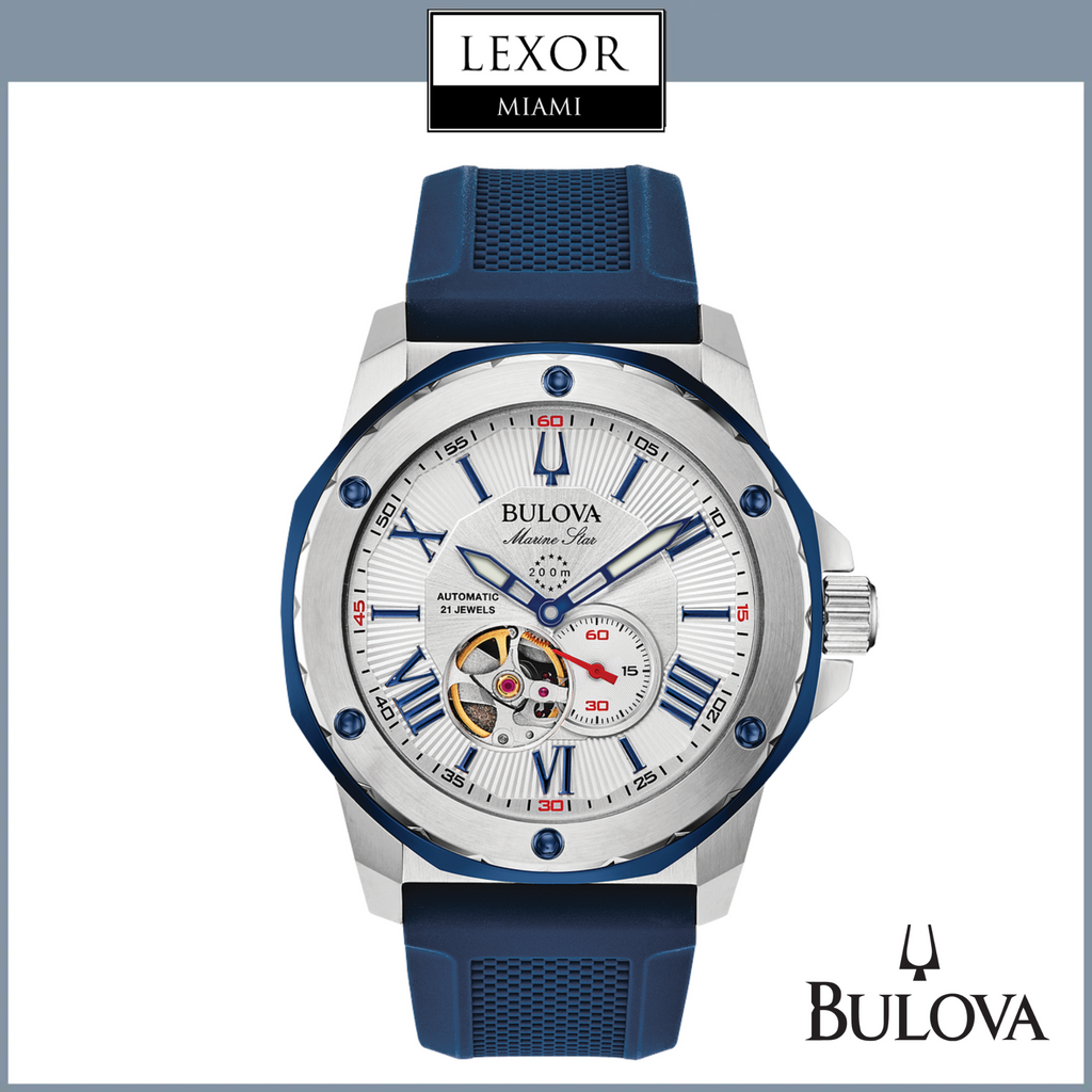 Introducing the new Marine Star featuring a three-hand automatic movement showcased in an open aperture. Silver tone stainless steel case with blue tone outer ring. Silver white dial with flat mineral crystal. Blue textured silicone strap with a contrasting red underside. Water resistance to 200 meters.
