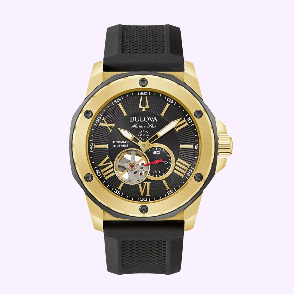 O relógio masculino Bulova Marine Star é um relógio clássico com um legado que remonta a décadas. O movimento automático de 21 joias de batimento cardíaco aberto é exibido na abertura do mostrador e no fundo da caixa de exposição. A caixa de aço inoxidável em tom dourado é acentuada com preto e apresenta um mostrador preto e um cristal mineral plano. A pulseira de silicone texturizada preta tem uma parte inferior vermelha contrastante, e o relógio é resistente à água até 200 metros, fazendo jus ao seu nome como um relógio que pode ir aonde você for sem perder o ritmo.
