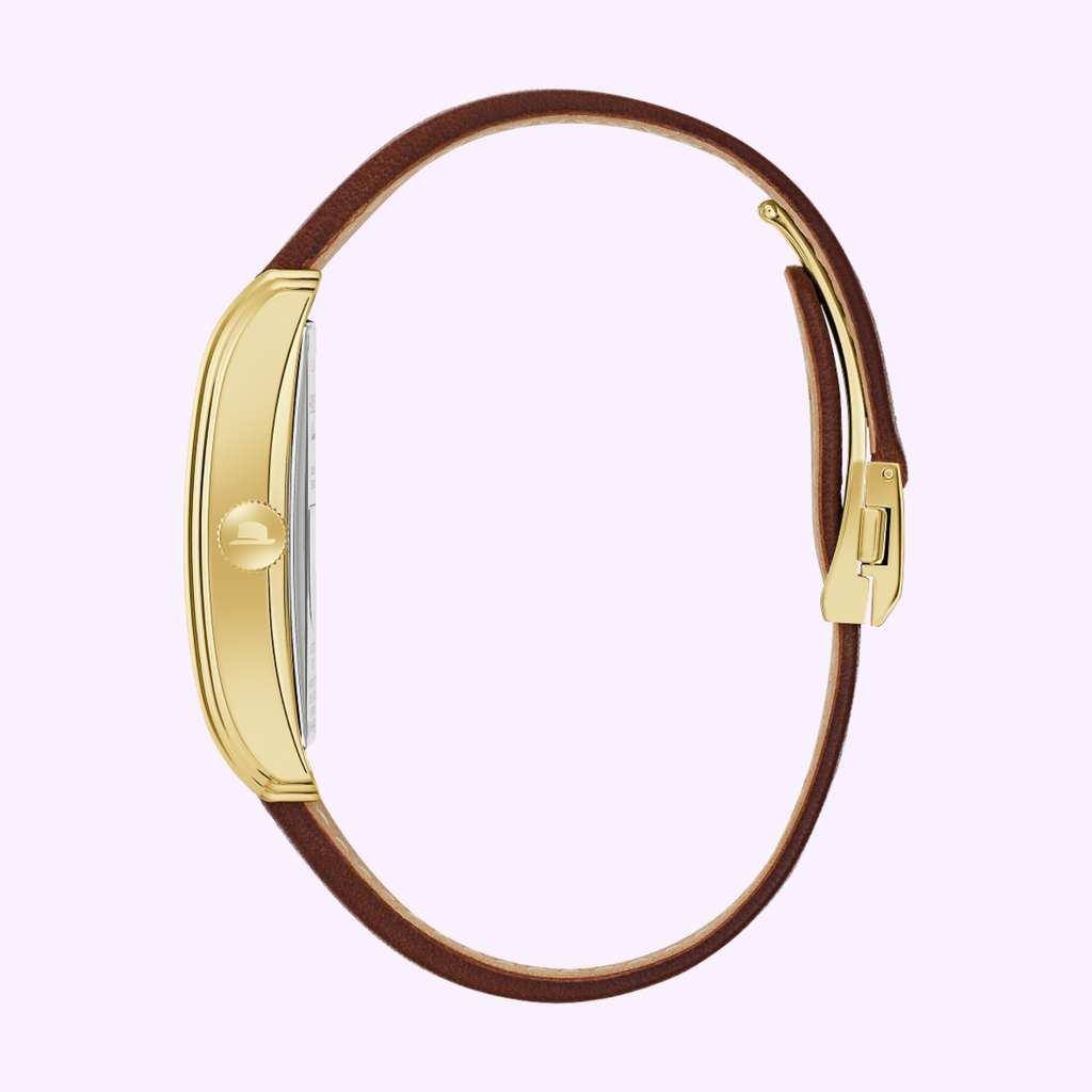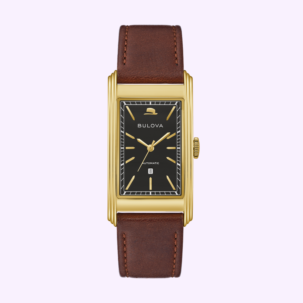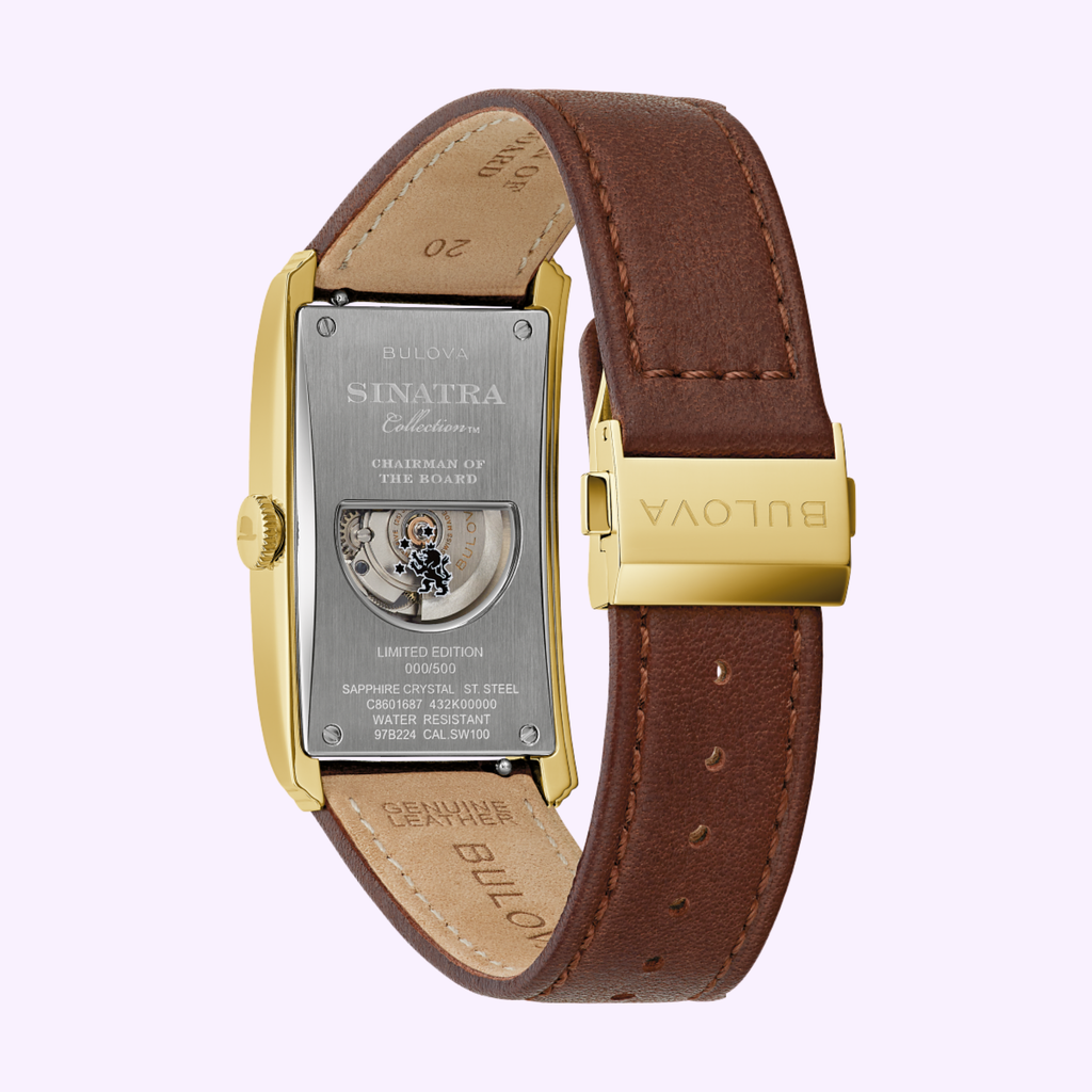 Imbued with Bulova’s vintage art deco design and the unforgettable style of Ol’ Blue Eyes himself, Bulova presents the “Chairman of the Board” timepiece from the Frank Sinatra collection. Taking cues from Bulova’s 1936 “President” model, this timepiece features a 5-micron 18k gold-plated stainless steel case with stepped flanks and a long, sweeping arc that delivers unparalleled style and exceptional comfort on the wrist. Under a double curved sapphire crystal, the rich black dial is enhanced by gold-tone hour markers and hands, with Sinatra’s iconic fedora marking 12 o’clock. The date window at 6 o’clock remains subtle yet functional, offering added versatility to the watch. On display through a see-through case back, this luxurious timepiece is powered by a Swiss automatic movement with 25 jewels and a power reserve of 42 hours. The case back is further customized with the depiction of the Sinatra family crest: a crowned lion reaching for the stars. The watch is complemented by a fine brown calfskin leather strap finished with a new foldover buckle in matching 5-micron 18k gold plating. Limited to 500 individually numbered pieces, each “Chairman of the Board” is delivered in a lacquered box with a limited-edition card and plaque, and a Frank Sinatra storybook.
