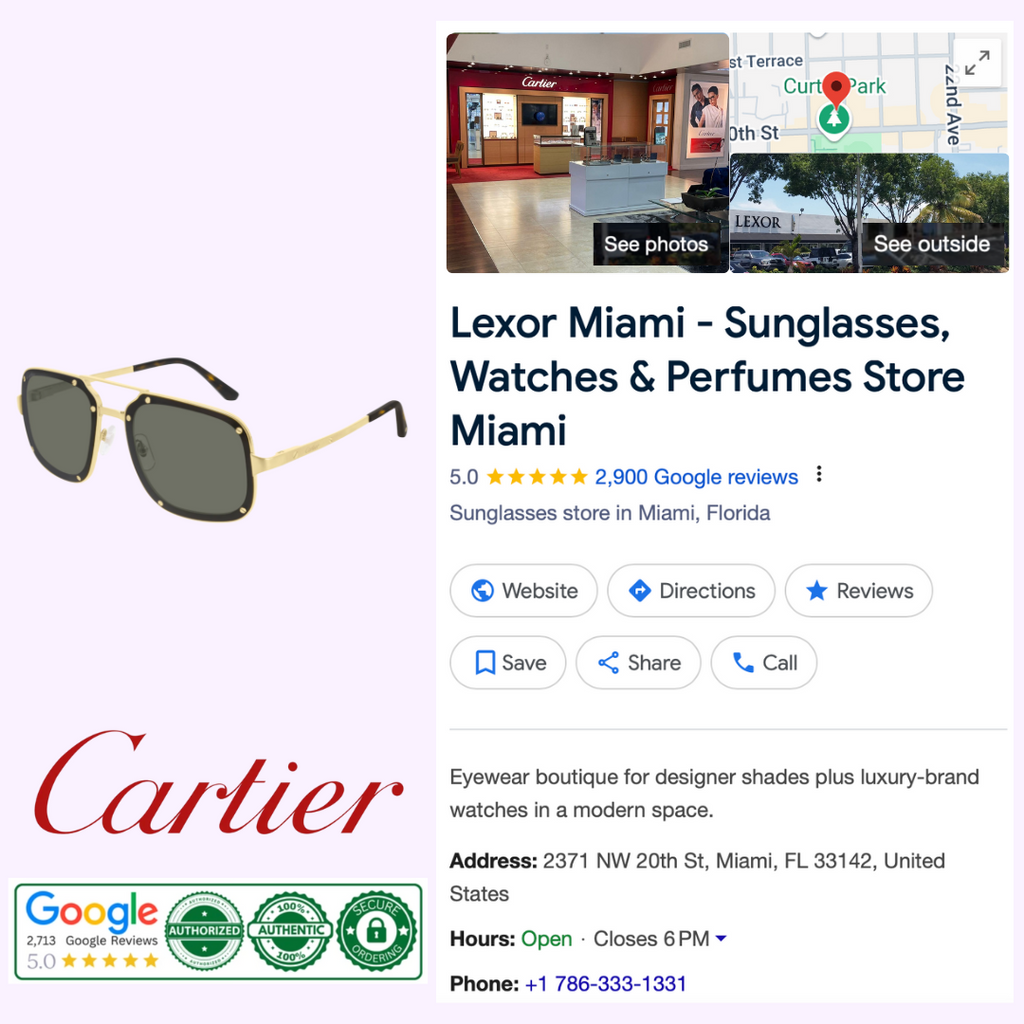 Revendedor autorizado Cartier Lexor Miami. Cartier Fundada em 1847, a Cartier não é apenas um dos nomes mais estabelecidos no mundo das joias e relógios, mas também uma referência do verdadeiro luxo contemporâneo. A Cartier cria óculos excepcionais e desenvolve cada design a partir de seu próprio vocabulário, exibindo criatividade distinta, savoir-faire excepcional e estilo icônico liderado por uma visão clara.
