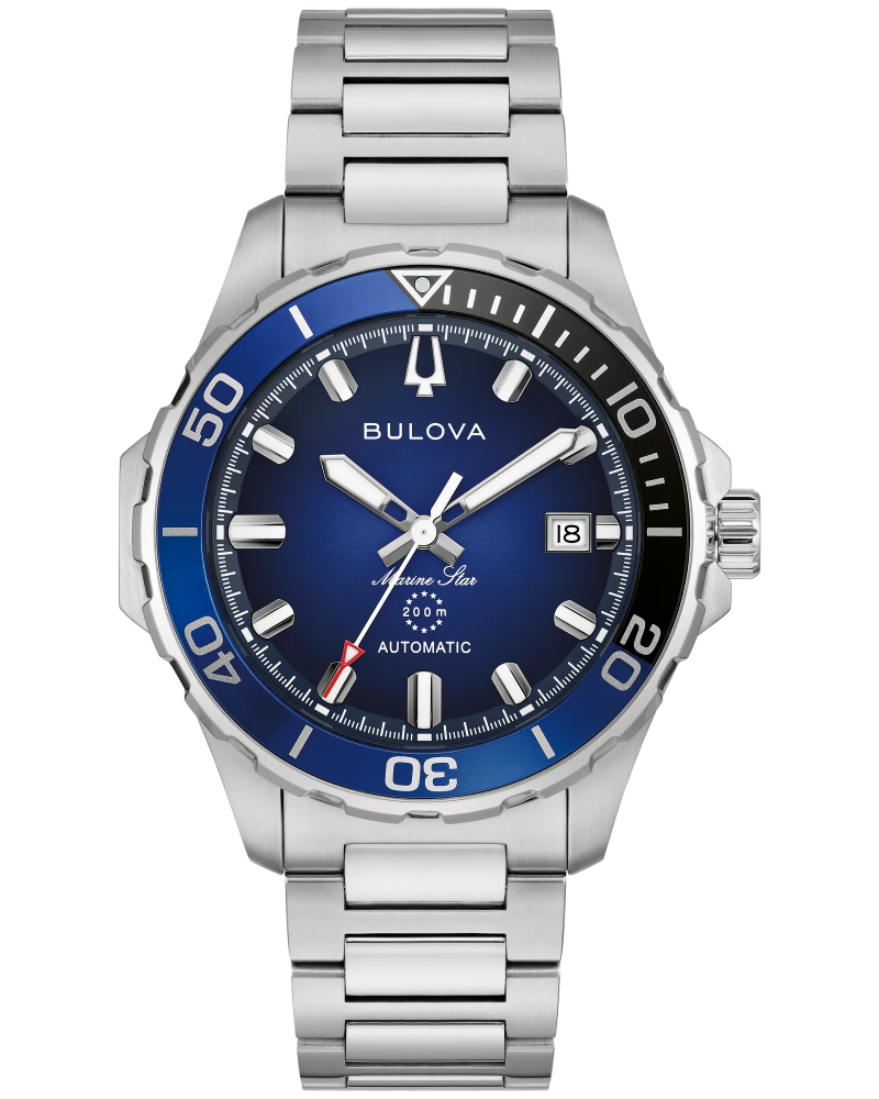 An uncompromising redesign of one of Bulova’s most celebrated models, the new men’s Marine Star Series B watch strikes the perfect balance between form and function. Perfectly sized at 41mm, the stainless steel case features 200m of water resistance, a screw-down crown, and a sapphire crystal, while its new unidirectional bezel has a bi-color aluminum insert with a timing scale. Complementing the blue and black bezel, the sunray dial shifts from a bright blue center to black, mimicking the gradient of the ocean as it deepens. Bold, luminous hands and hour markers ensure optimal legibility above and below the waves. The watch is paired with a premium H-link bracelet and has a case back crystal to show off the automatic movement with 42 hours of power. Reimagined and better than ever, the new Bulova men’s Marine Star Series B watch is the perfect companion for every adventure, near and far.