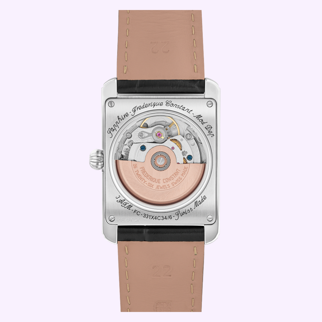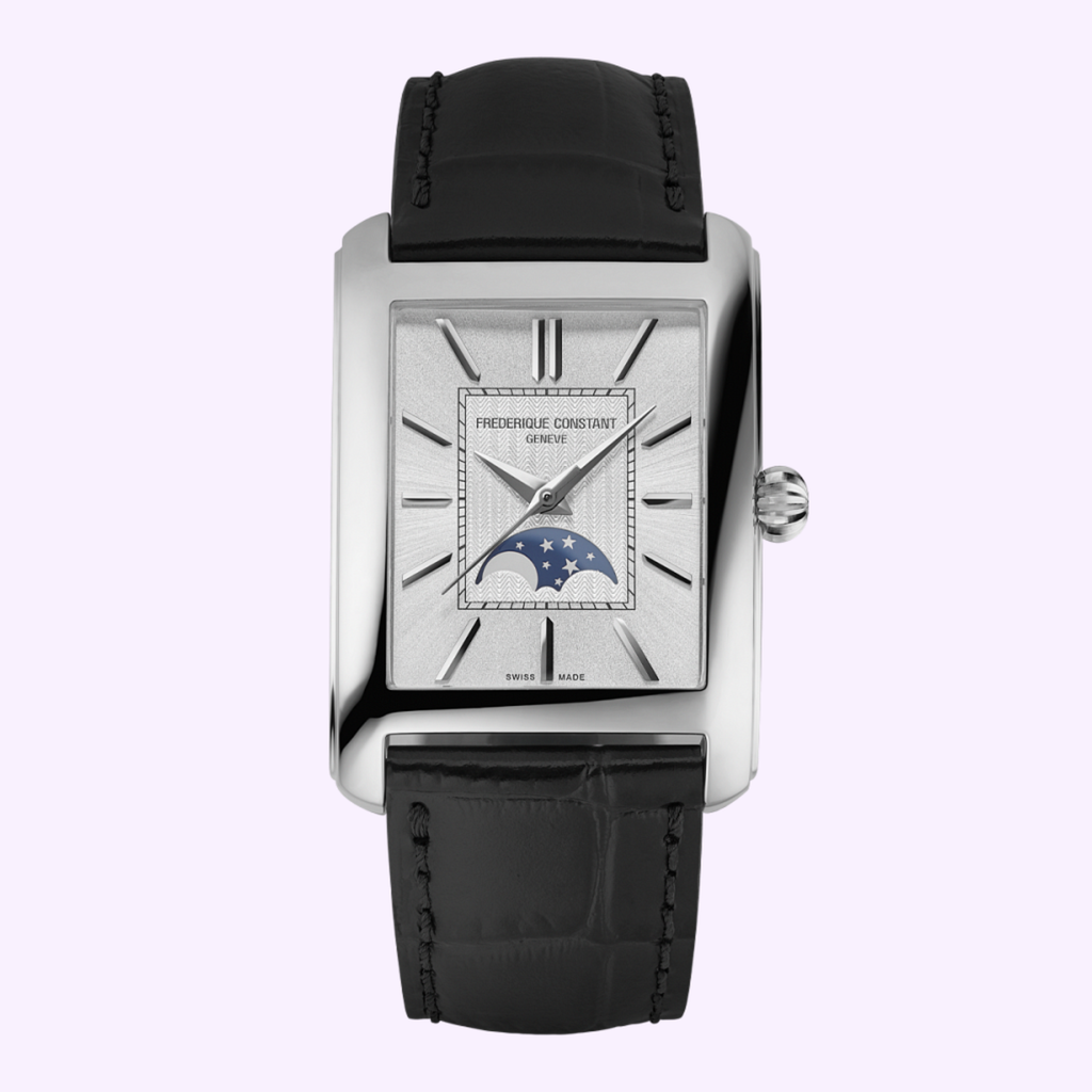 The Classics Carrée presents an elegant, retro 1920s look that fits perfectly within the Brand's philosophy, bringing back memories of incredibly sophisticated social events, while adding a few new features. The Classics Carrée Moonphase Automatic is set on a polished stainless steel 2-part case in a unisex 42.30x30mm size. Featuring the FC-333 caliber with a 38-hour power reserve, this timepiece includes a silver color dial with sunray finishing, and guilloché in the center. Polished silver tone hour, minutes, seconds, indexes, and the brands iconic moonphase. Delivered on a black calf leather strap.