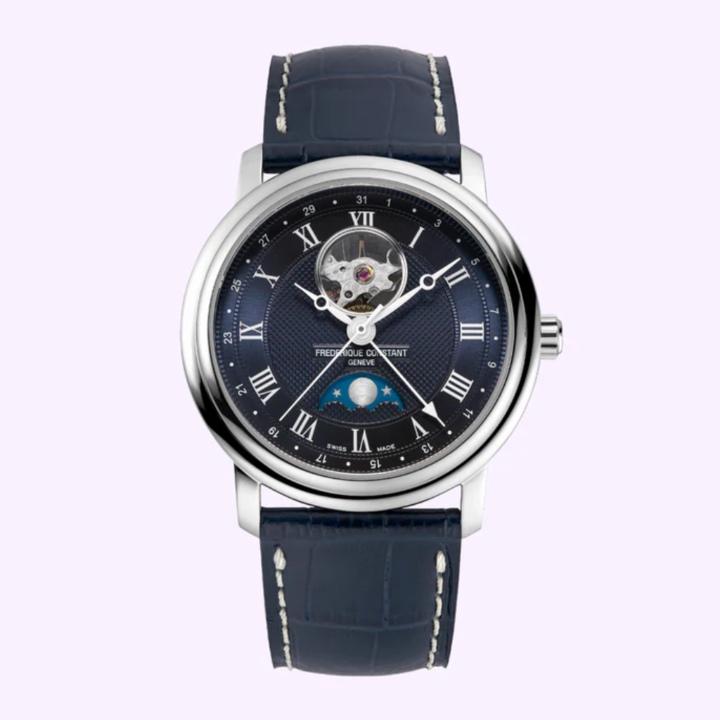 Equipped with the FC-335 Heart Beat automatic movement, the Classics Heart Beat Moonphase Date showcases an elaborately decorated dial: a classic Clous de Paris guilloché decoration accentuated with traditional Roman numerals indexes. The emblematic aperture at 12 o’clock, signature of the Heart Beat timepieces, reveals the escapement in continuous motion. This watch features the hours, minutes, seconds, moon phase and, a date pointer.