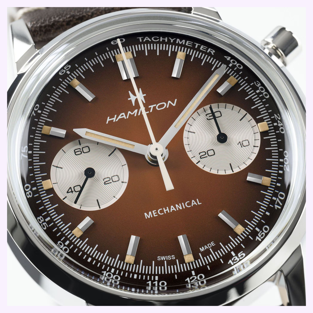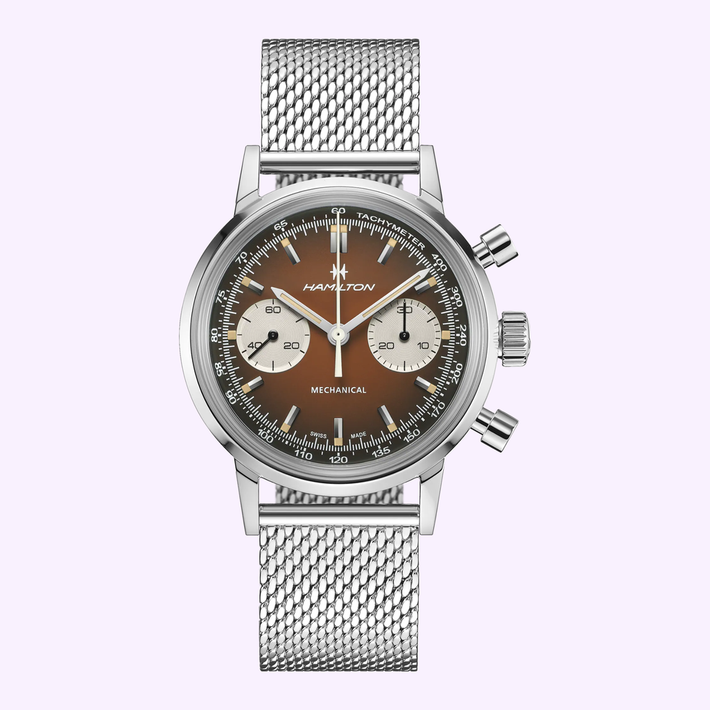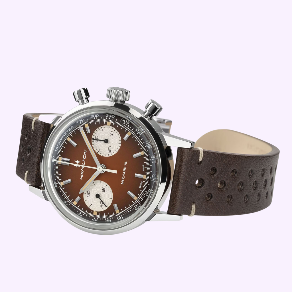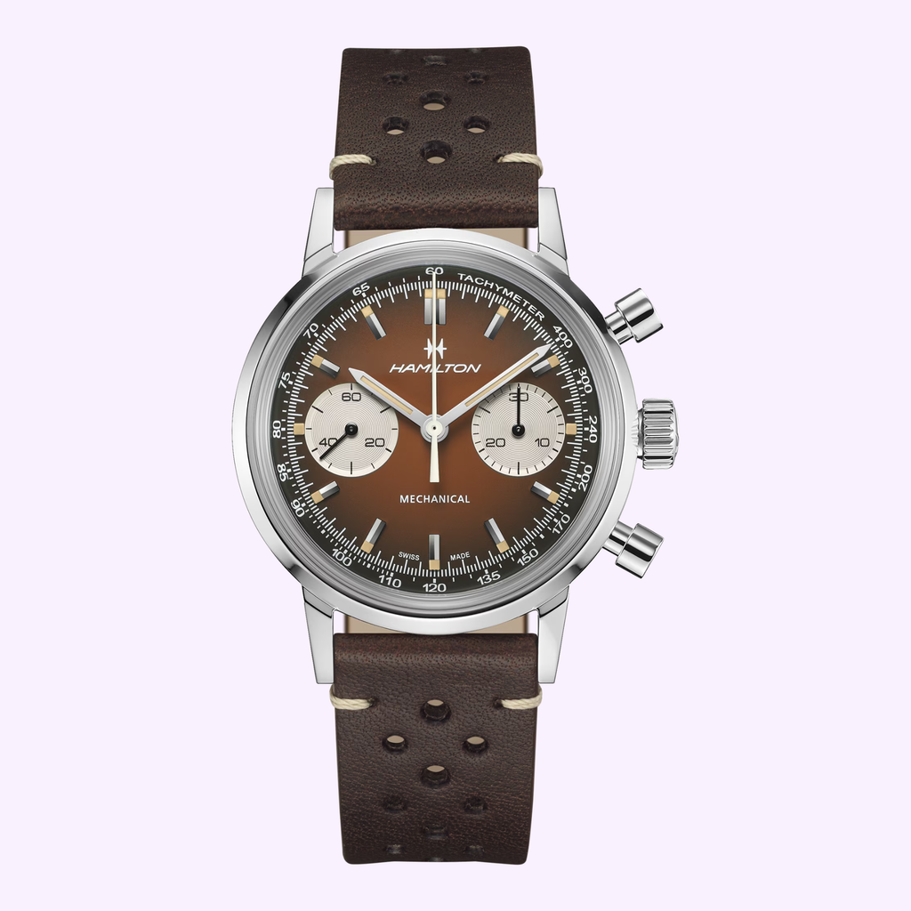 Infused with the spirit of 70s racing, the American Classic Chronograph 40mm in vintage brown captures timeless Americana style. Its smoky finish and retro color accents evoke the thrill of the track, while racing-inspired perforated straps complete the look. Paired with a second versatile mesh bracelet delivered in a bundle packaging, this automatic chronograph is a bold statement for those who embrace freedom and speed.