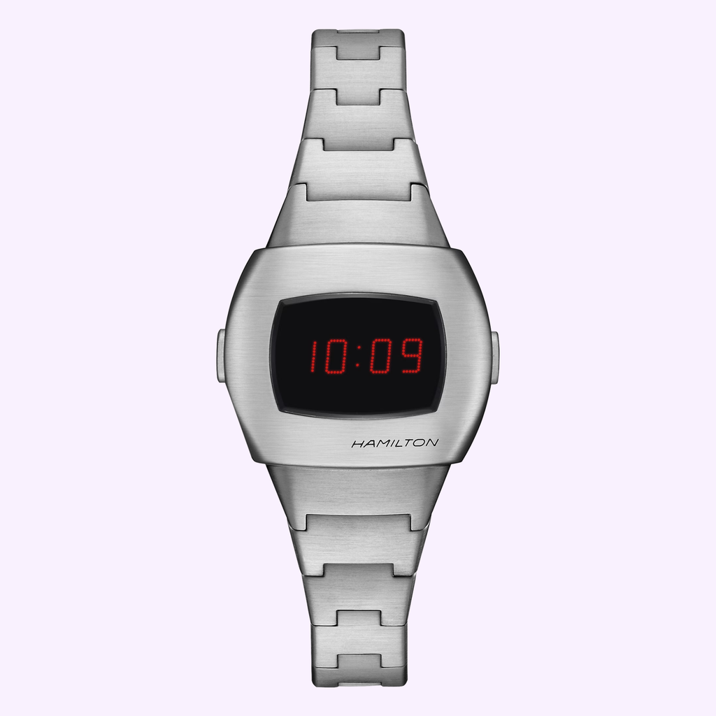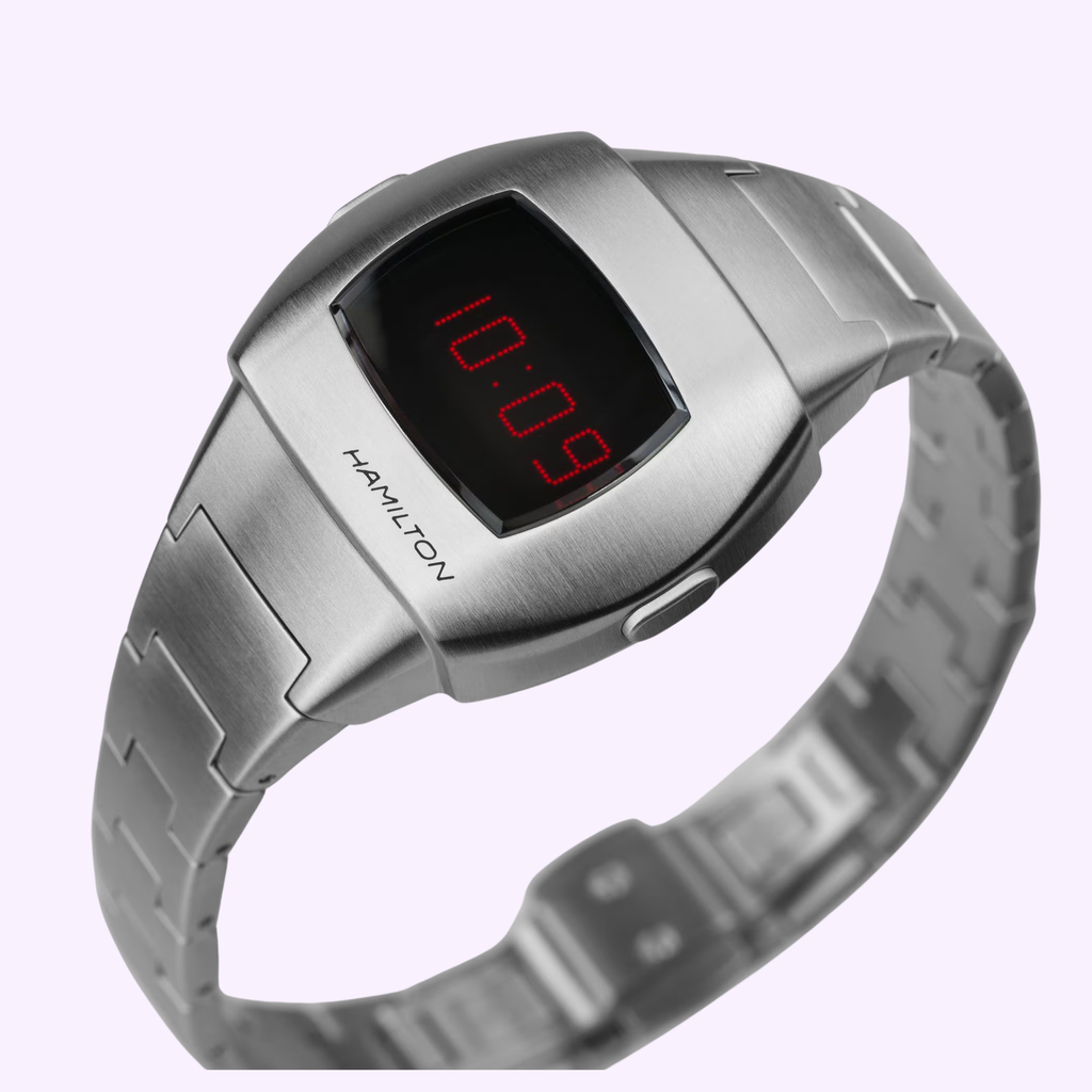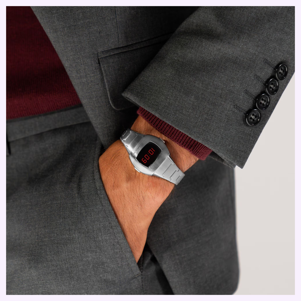 Reimagined for today and as cool as ever, the PSR returns in the same unmistakable style of the first digital watch that changed the world. Inspired by the original, vintage shape of the Cushion Pulsar model, first introduced in 1974, it remains emblematic of the space age-era. Featuring a brand-new quartz module, the PSR 74 sports the same hybrid display technology, combining reflective LCD (Liquid Crystal Display) and emissive OLED (Organic Light Emitting Diodes). The newly added second pusher adds a convenient date function, with red numerals display.