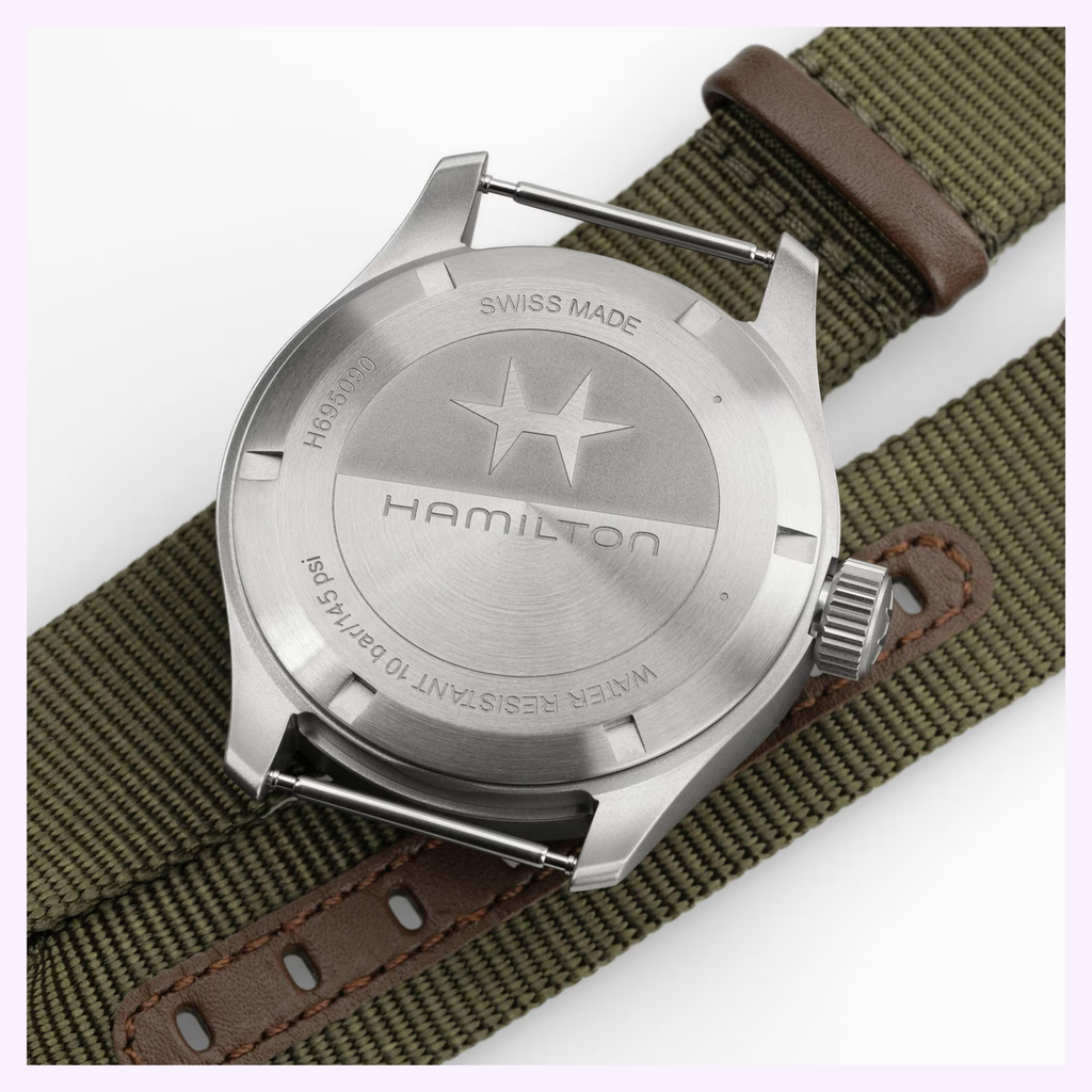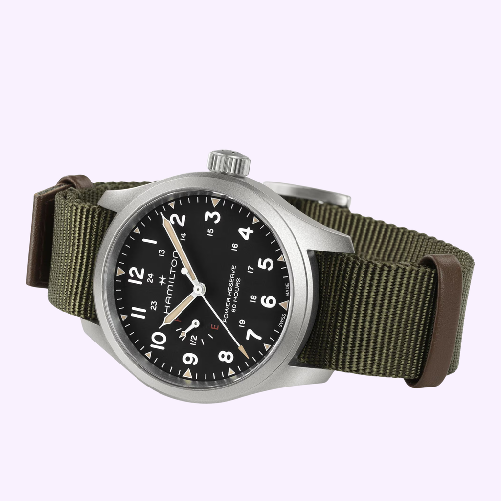 The Khaki Field Mechanical Power Reserve 40mm honors the heritage design and essential functionality of the Khaki family, while introducing modern features and the latest in watchmaking technology and innovation. With a new manual-winding H-23 movement, developed by ETA exclusively for Hamilton, it allows (for the first time) for the 80-hour power reserve to be visualized directly on the dial. Fitted with a rugged khaki green NATO strap, the black dial proudly displays "power reserve 80 hours" and shows "F" for full and "E" for empty, to underscore this exceptional and utility-focused feature.