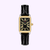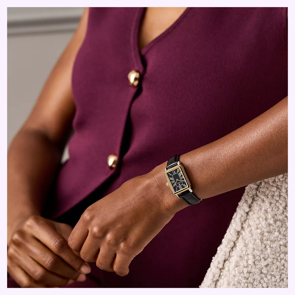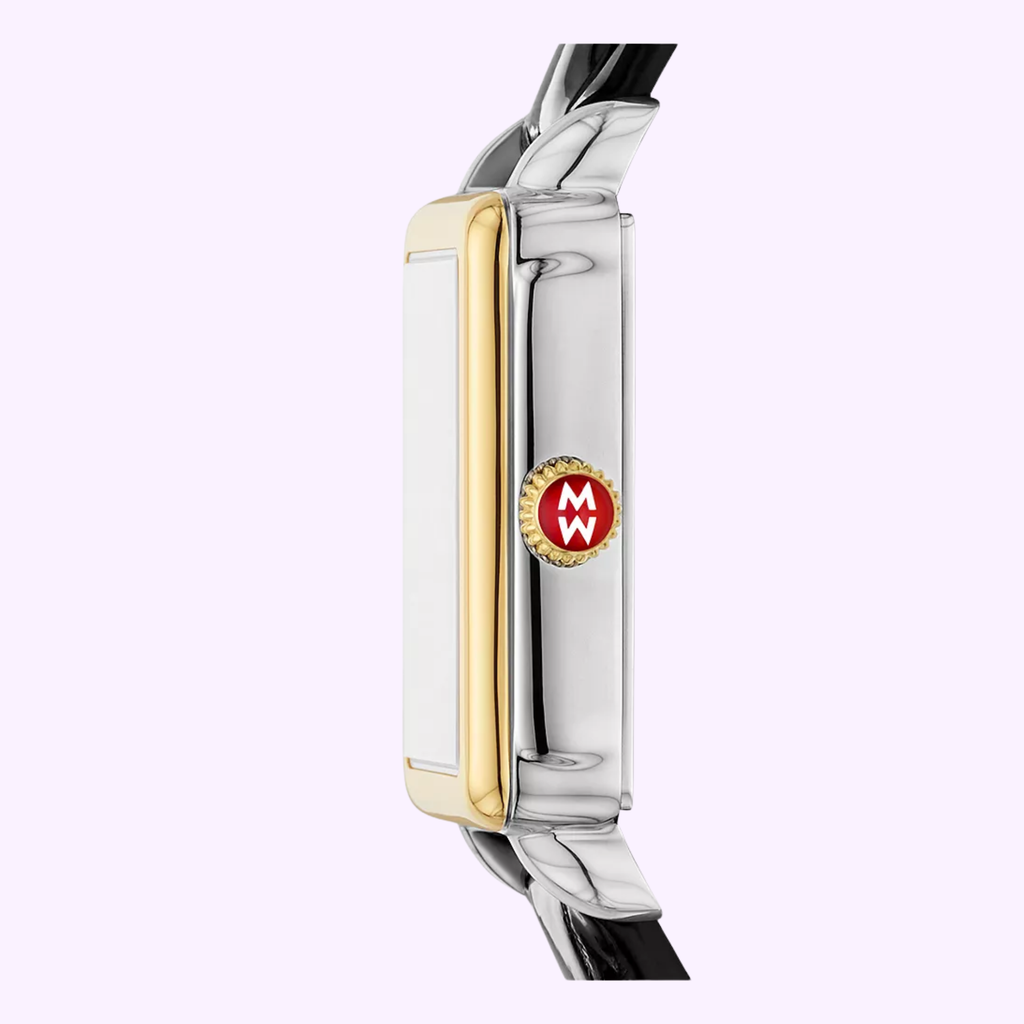 Elegant and architectural, this rectangular watch from the Deco Park collection perfectly balances form and function. The glossy noir dial is housed within a two-tone stainless steel and 18K gold-plated case and Swiss movement. The black leather croco-embossed strap is interchangeable with any 14mm MICHELE strap.