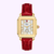 The Deco Mid Sport combines a vibrant ruby red color with refined design. Its 31mm rectangular gold-tone stainless steel case frames a mother-of-pearl white dial, accented with polished roman numeral indexes and a sub-second movement. The shiny, croco-embossed leather strap, is interchangeable with any 16mm strap from MICHELE's collection, adding versatility to the design.