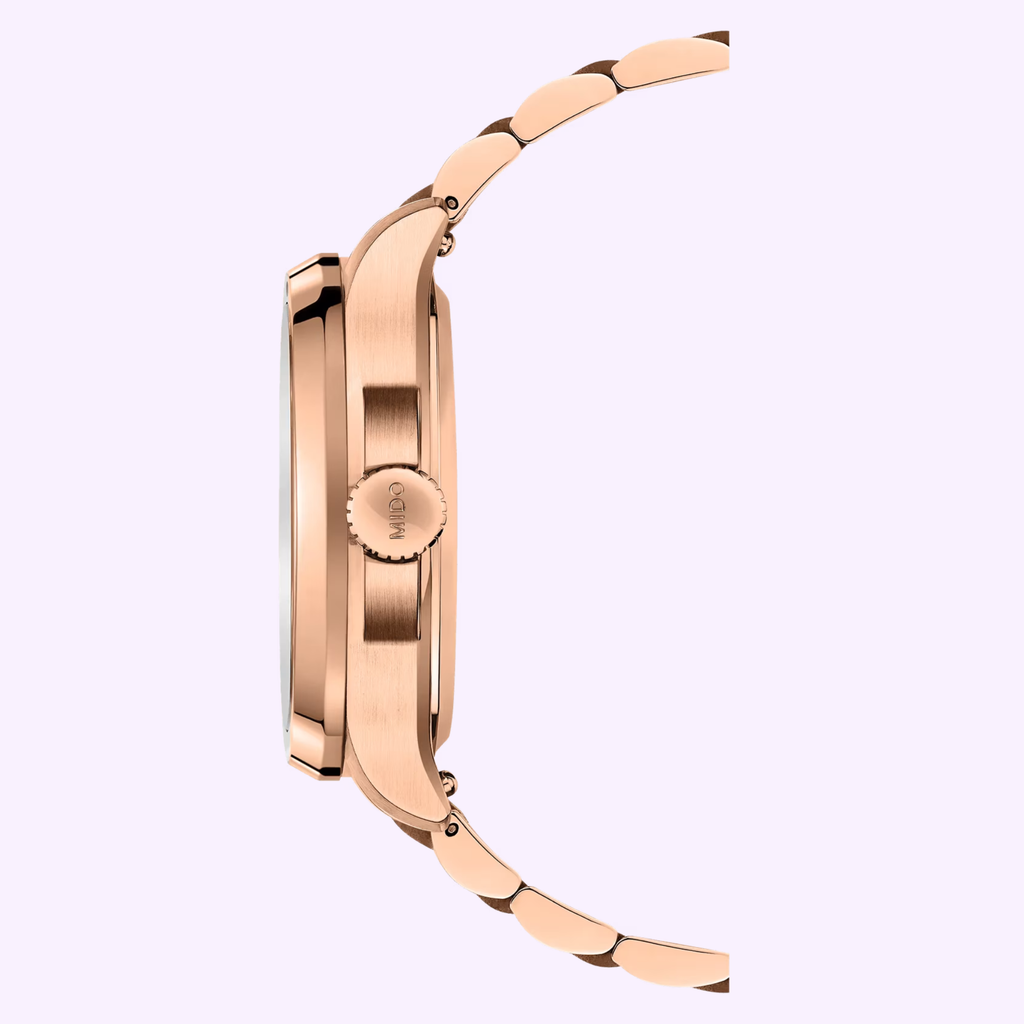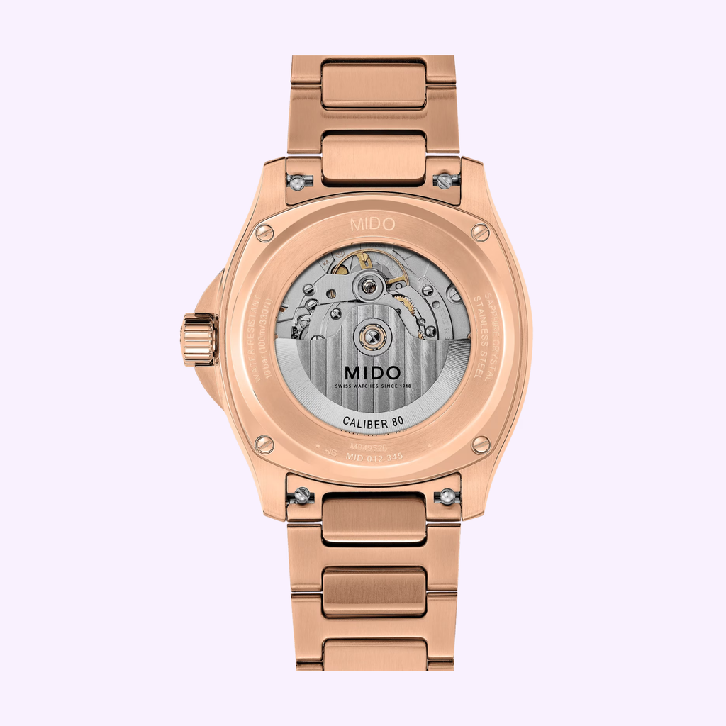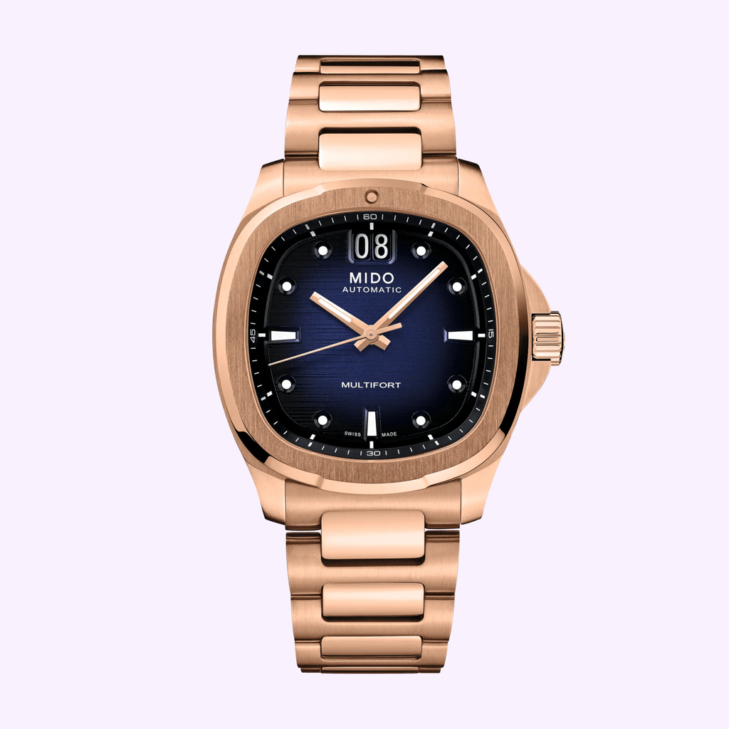 A brilliant flashback! Born from MIDO's extraordinary heritage, the TV-shaped case returns to centre stage for the Multifort TV Big Date, as intense as it is precise, thanks to its formidable mechanical movement. The modern and dynamic design of this Swiss watch is highlighted by a striking dial and, along with its distinctive function: the BIG DATE at 12 o'clock. Its formidable latest-generation automatic movement, Caliber 80, is equipped with a high-tech balance spring in Nivachron™, which offers outstanding resistance to shocks and magnetic fields.