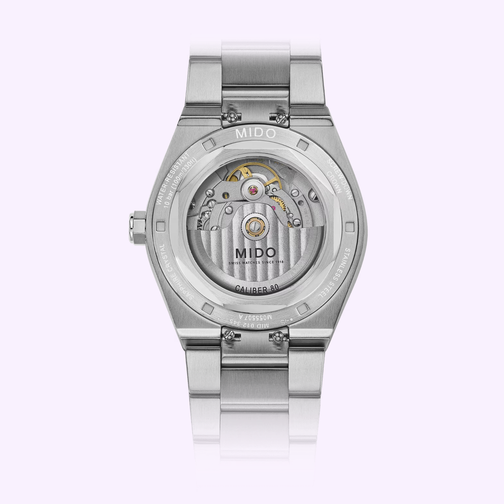 Powered by the renowned Caliber 80 Swiss automatic movement, visible through the transparent case back, this watch embodies MIDO’s TECHNOMETRY philosophy — the perfect fusion of technology and geometry.