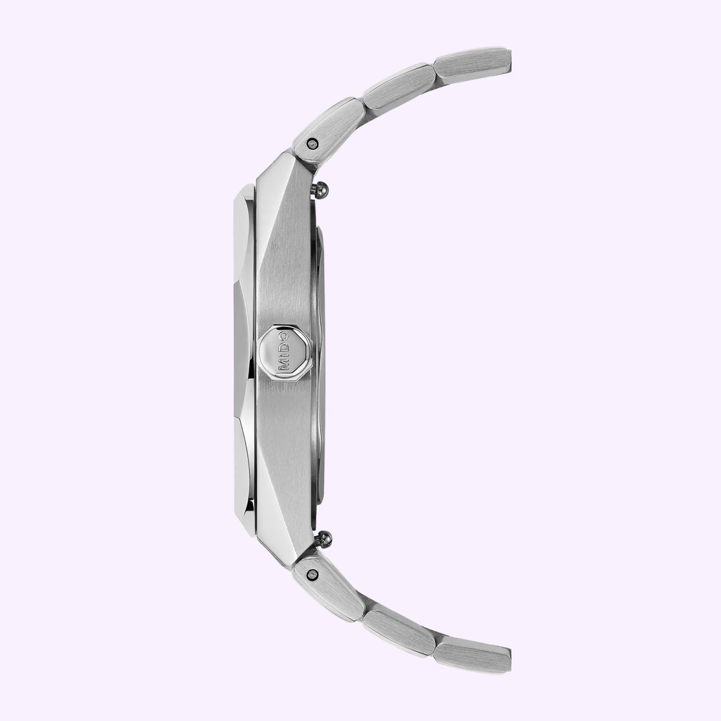With its clean lines, balanced 40 mm case, and distinctive octagonal bezel, this model showcases a contemporary identity rooted in horological heritage. The horizontally grooved dial plays with rhythm and depth, reflecting light dynamically while reinforcing its structural aesthetic.