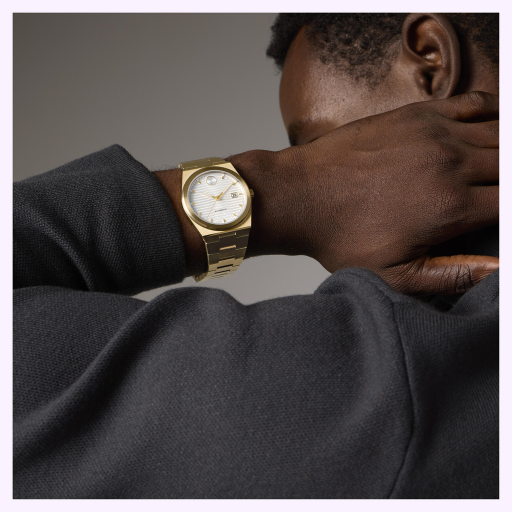 The BOLD Quest Automatic looks to the future with a shaped case and an integrated bracelet. A Swiss made self-winding movement drives this watch, powered by the motion of your wrist. This 39mm watch features a white dual texture dial, yellow gold-tone hands, an exhibition case back, and our signature dot at 12 o'clock.
