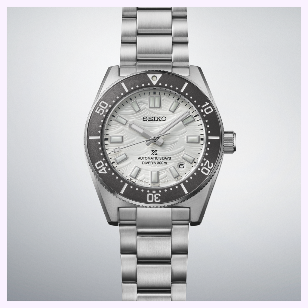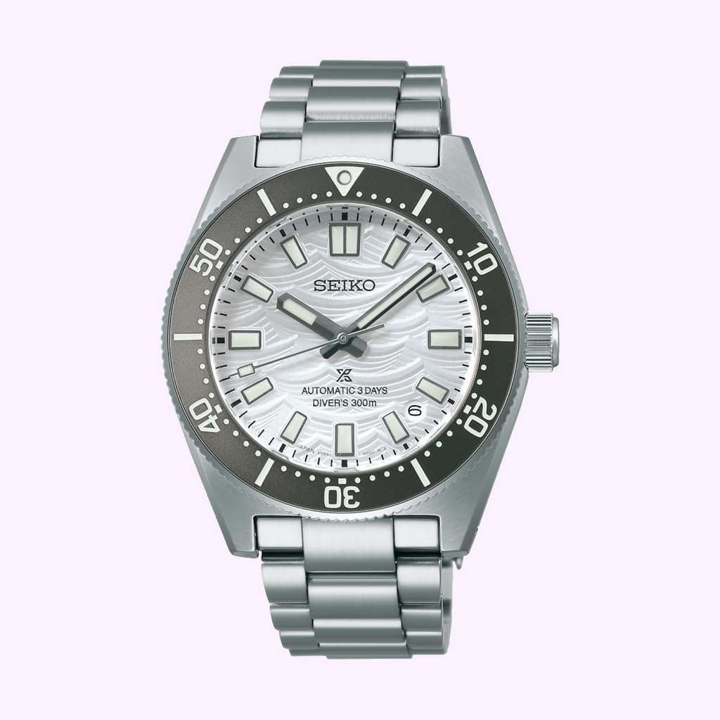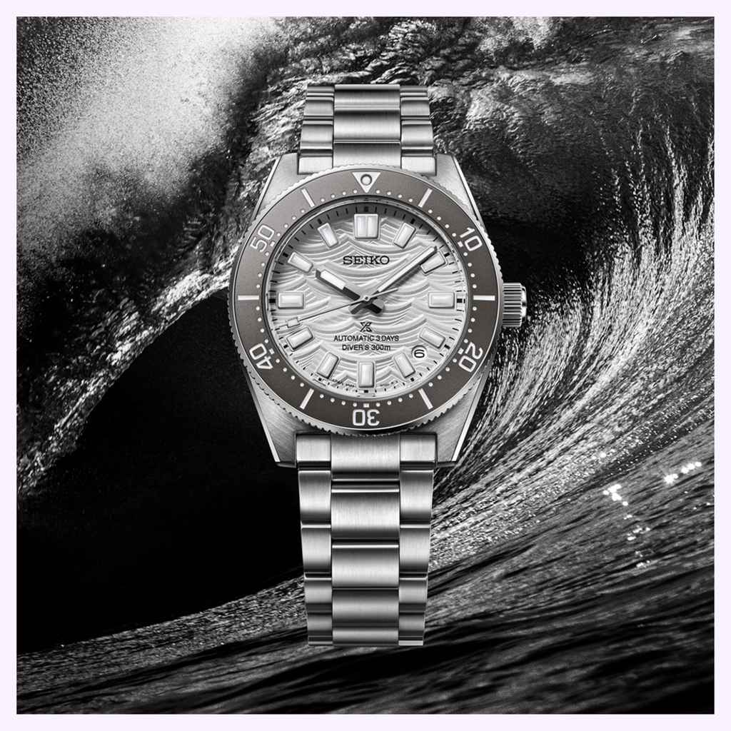 1965 Heritage Seiko Diver’s 60th Anniversary Limited Edition. Seiko Prospex challenges every limit with timepieces created to exceed expectations, engineered with superior style and innovative technology for the sea, sky or land. Driven by rich legacy that has set the standard for dive watch specifications and a heritage of iconic design, Prospex continues to keep going forward with precision timekeeping, crafted for the modern world. Updated with more power, greater water resistance, higher legibility and a compact construction for maximum comfort, this extraordinary Limited Edition, available in a controlled production run of 6,000, with the serial number engraved on each caseback, celebrates the 60th anniversary of Seiko’s 1965 first diver’s watch. Framed by a coordinating uni-directional rotating elapsed timing bezel, the silver patterned dial draws inspiration from the “wave” mark, created in 1962 as a symbol of high-grade water-resistant timepieces and displayed on the casebacks of Seiko’s divers to this day. The dial layout also boasts improved symmetry with LumiBrite coating on the hands and all 12 markers for enhanced visibility. The remarkable Limited Edition is equipped with a 24-jewel automatic movement that beats at a frequency of 21,600 vibrations per hour and offers an upgraded power reserve of approximately 72 hours along with manual winding capability. Crafted of stainless steel with super-hard coating, this superbly functional diver’s watch includes a curved sapphire crystal with anti-reflective coating on the inner surface, as well as a screwdown crown and caseback. Following ISO standards for scuba diving to depths of up to 300 meters, the innovative creation preserves a streamlined case profile while incorporating a bracelet made up of links with a short pitch and a specially developed slide adjuster clasp with a double lock, allowing for easy size adjustment. 300m Water Resistant