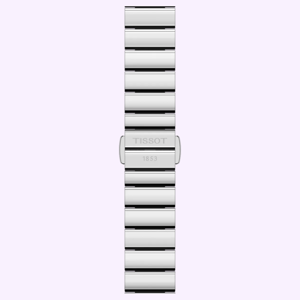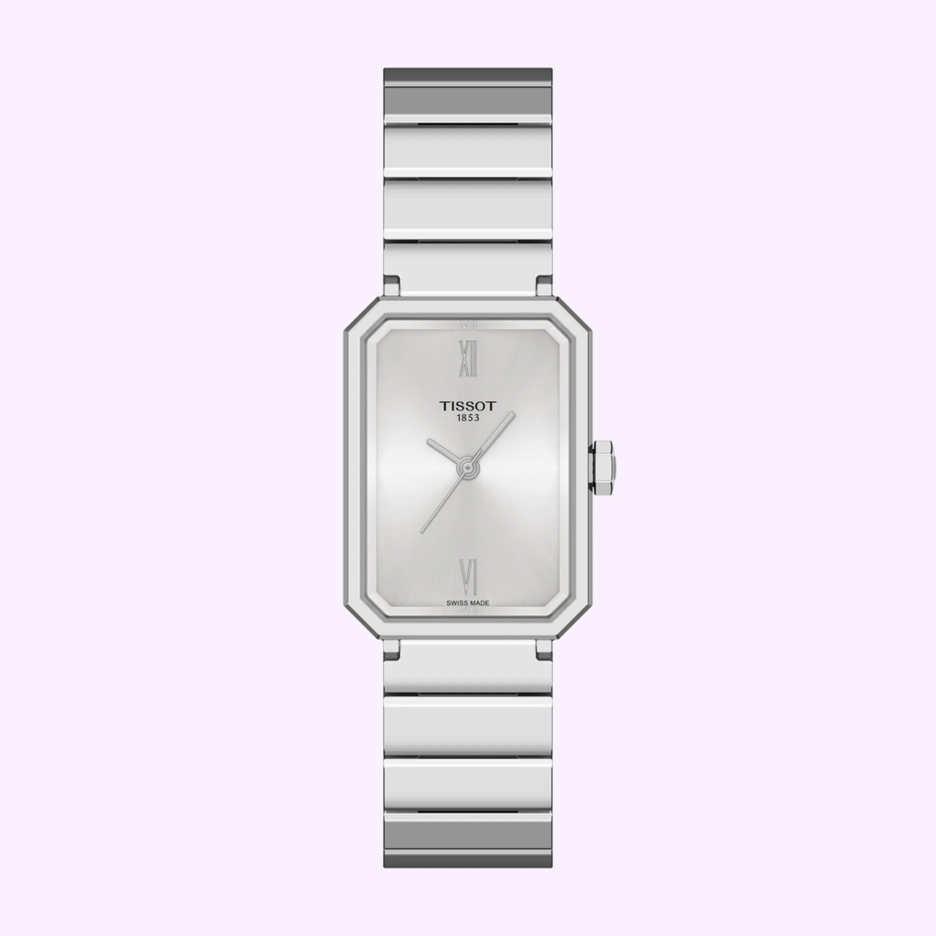 The SRV watch is inspired by the Art Deco times, developed in the 1920s. This time is characterized by geometric shapes and abstract patterns, become a dominant style in architecture, interior design, fashion and graphic arts. While the SRV is directly inspired by a model from 1975, that very design was itself a reinterpretation of Tissot’s earlier creations from the 1920s. The SRV’s quartz movement delivers precision that empowers to move forward fiercely and, with the End-of-Life indicator, the SRV anticipates her next move, so she’s always prepared. More than a name, SRV stands for, Sapphire Rectangle V: a faceted sapphire glass with a rectangular silhouette, and the ‘V’ a nod to its 5-bar water resistance, symbolized by the roman number 5. The metal bracelet is comfortable, robust, easy to clean and long-lasting.