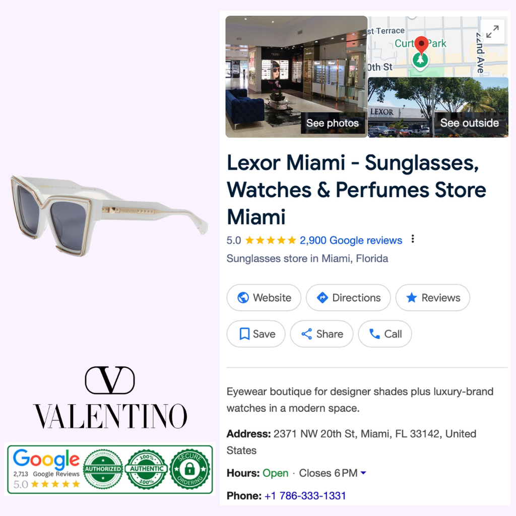 Lexor Miami Valentino Sunglasses Revendedor Autorizado em Miami 100% autêntico. Cada item que vendemos é garantido como novo e 100% original em todas as embalagens originais. Cada pedido incluirá um estojo original, pano e garantia do fabricante.